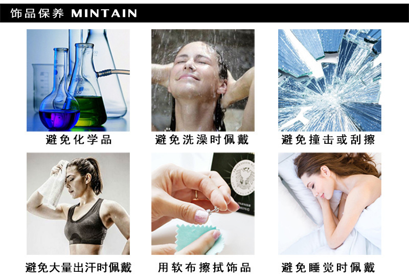 (1)避免饰品直接接触清水、香水、皂液、美发喷雾剂、樟脑丸、洗洁晶等带有化学成分物品对饰品的侵蚀。