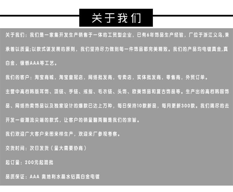 关于我们:我们是一家集开发生产销售于一体的工贸型企业,秉承着以质量谋发展,以款式谋发展的原则,我们坚持 做精品,尽力做到每一件饰品都精致。我们的产品均电镀真金,真白金,镶嵌AAA 。
