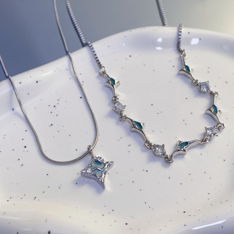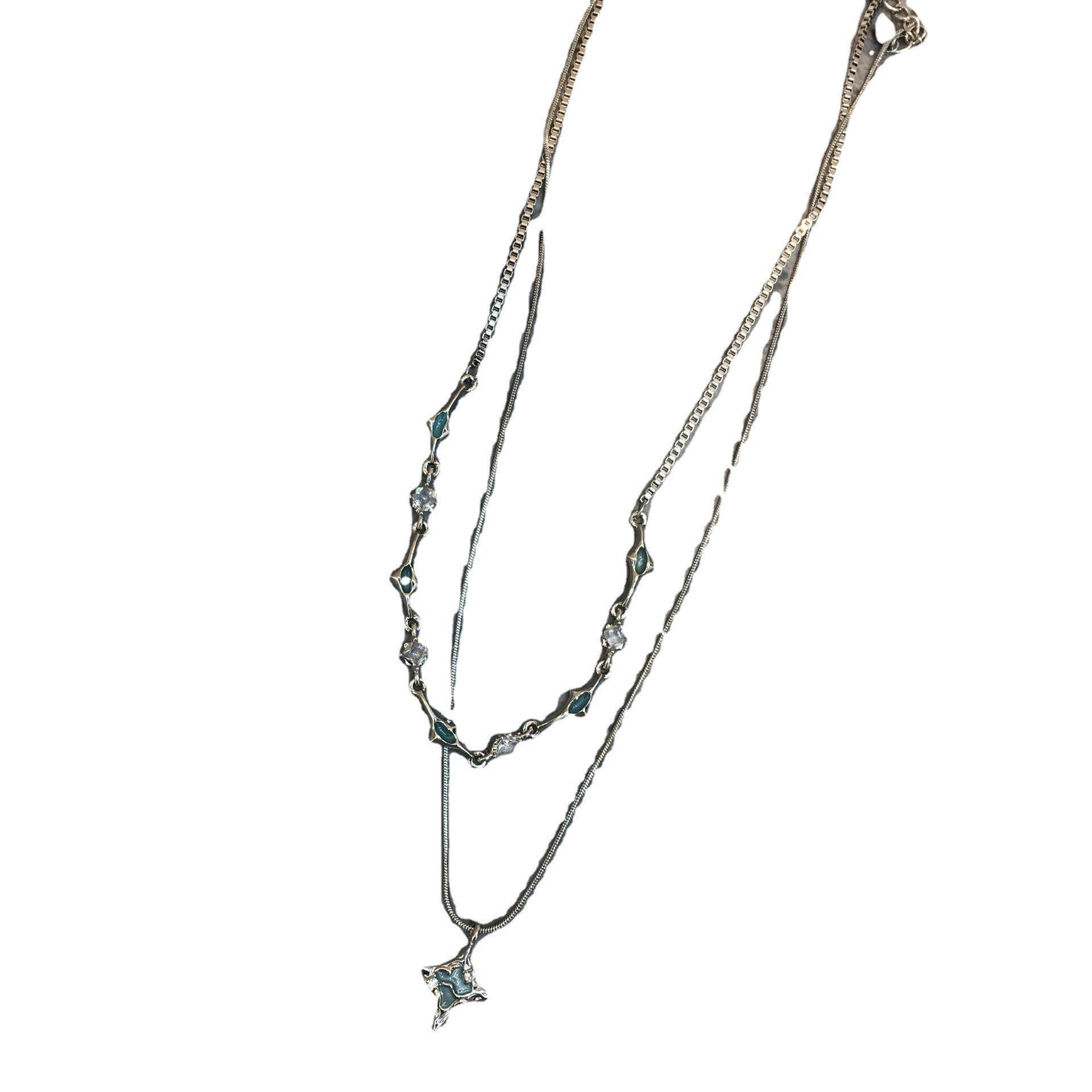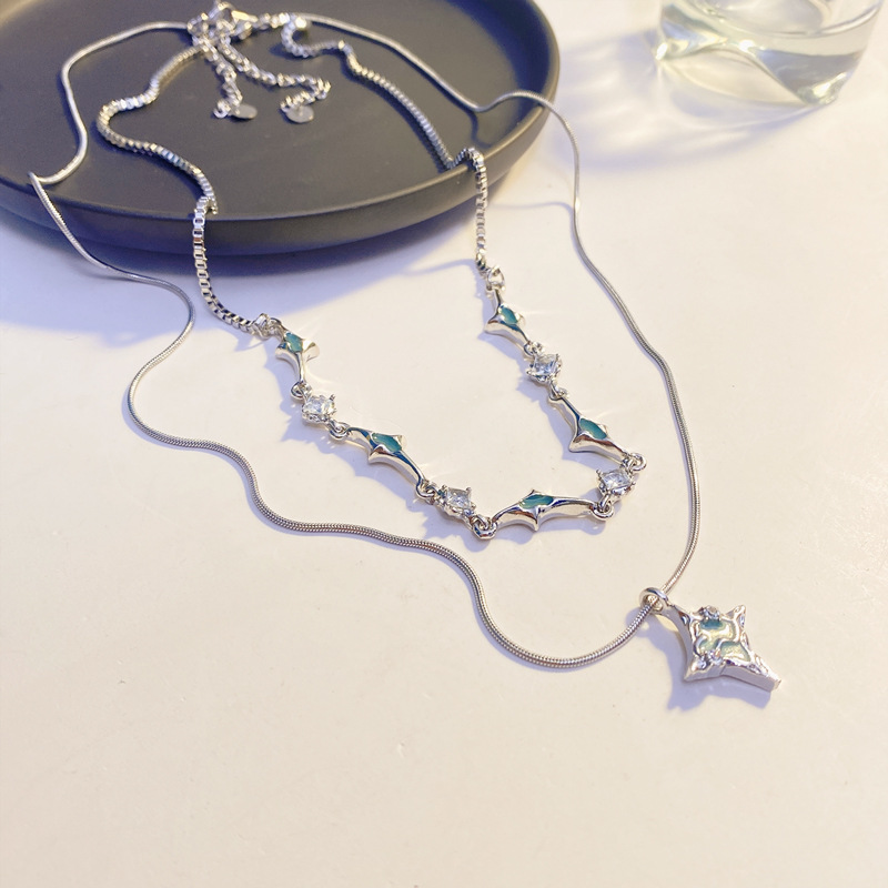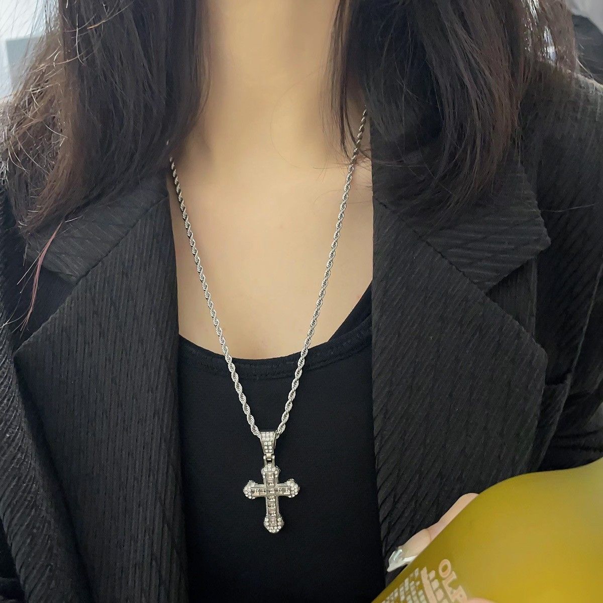 Blue Oil-Drip Cross Necklace for Men with Zircon Inlay, Double-Layer Hip-Hop Style Titanium Steel Chain Design, Fashionable Collarbone Chain