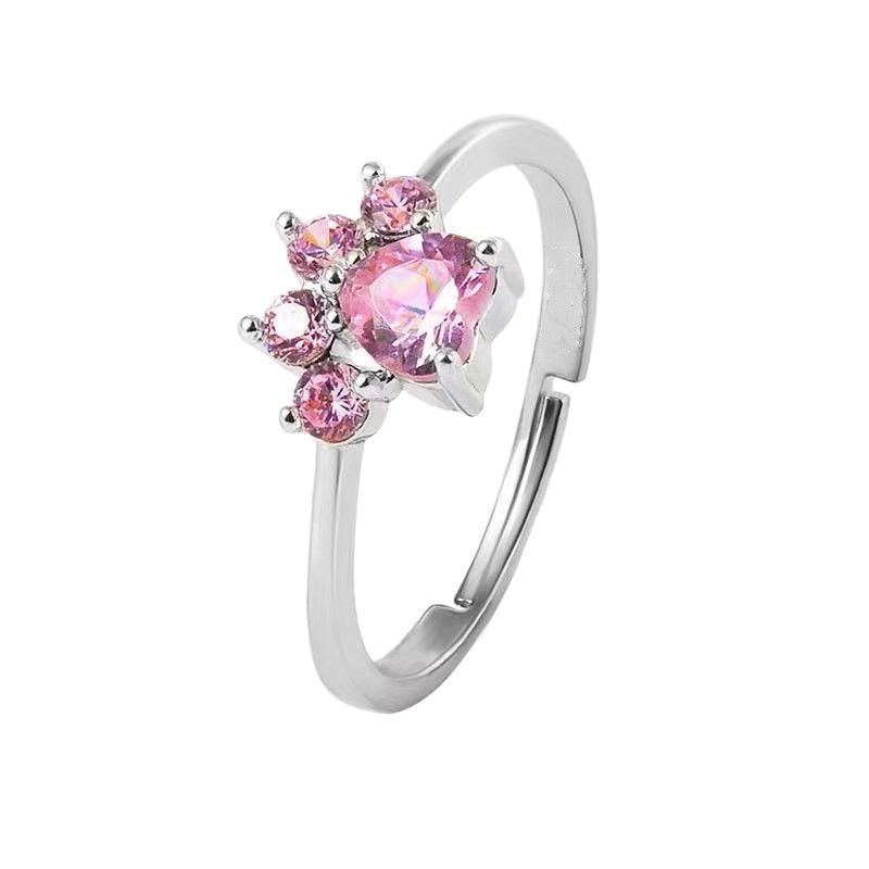 Fashionable Cartoon Cute Cat Paw Footprint Inlaid with Zircon Open Adjustable Ring for Women Japanese and Korean Simple Ring