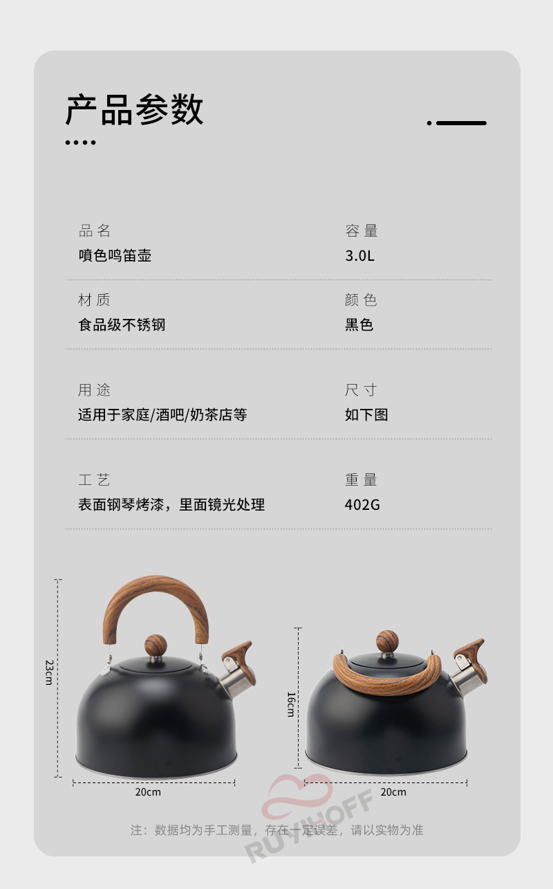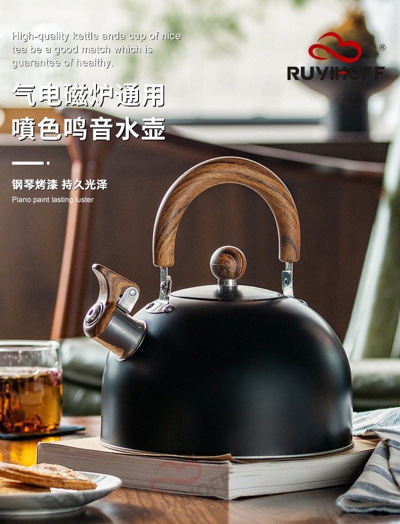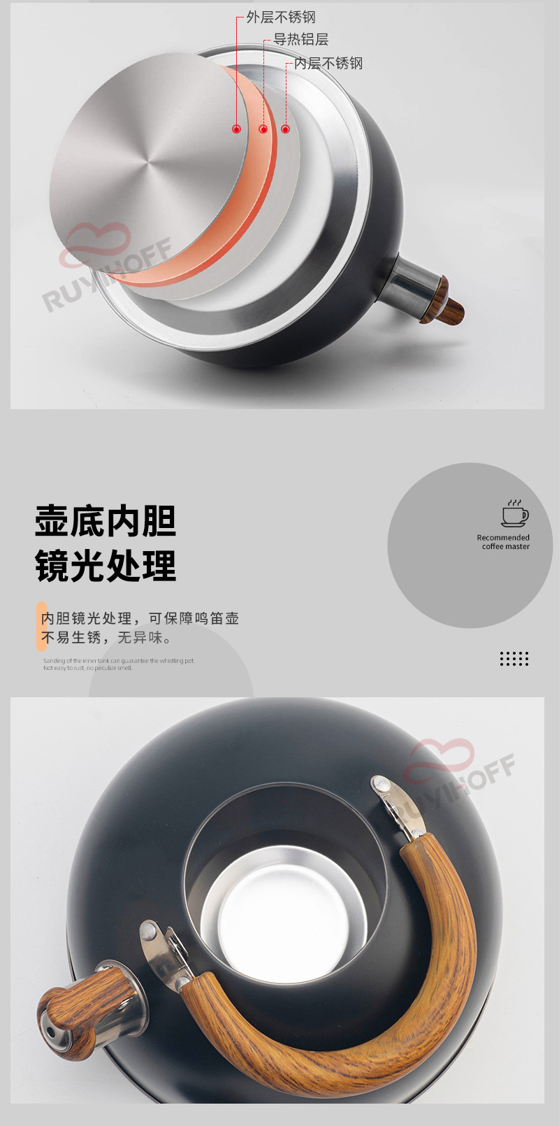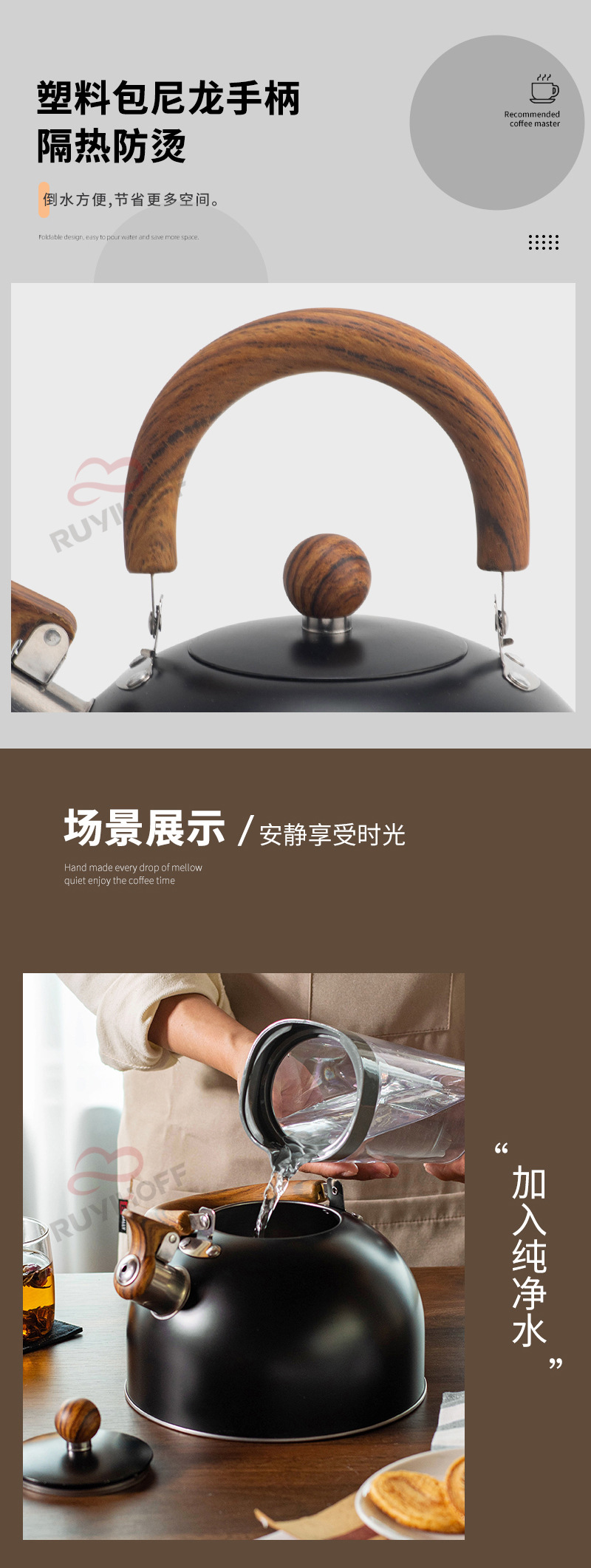 European-style whistle kettle boutique family bar wood grain handle stainless steel kettle 3L black whistle kettle