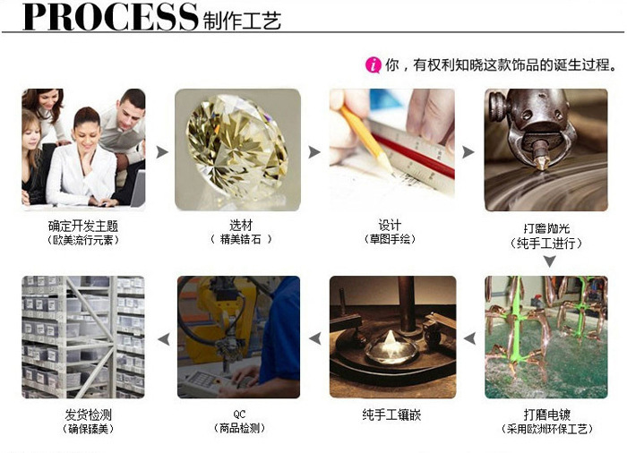 7、 镶锆石:主要分两种,一种是用AB胶粘上去的,因为是胶水,所以是很牢固的。另一种是,采用机器压镶,做工复杂,非常牢固,而且做工精细,但价格要比用AB胶粘的要贵哦。