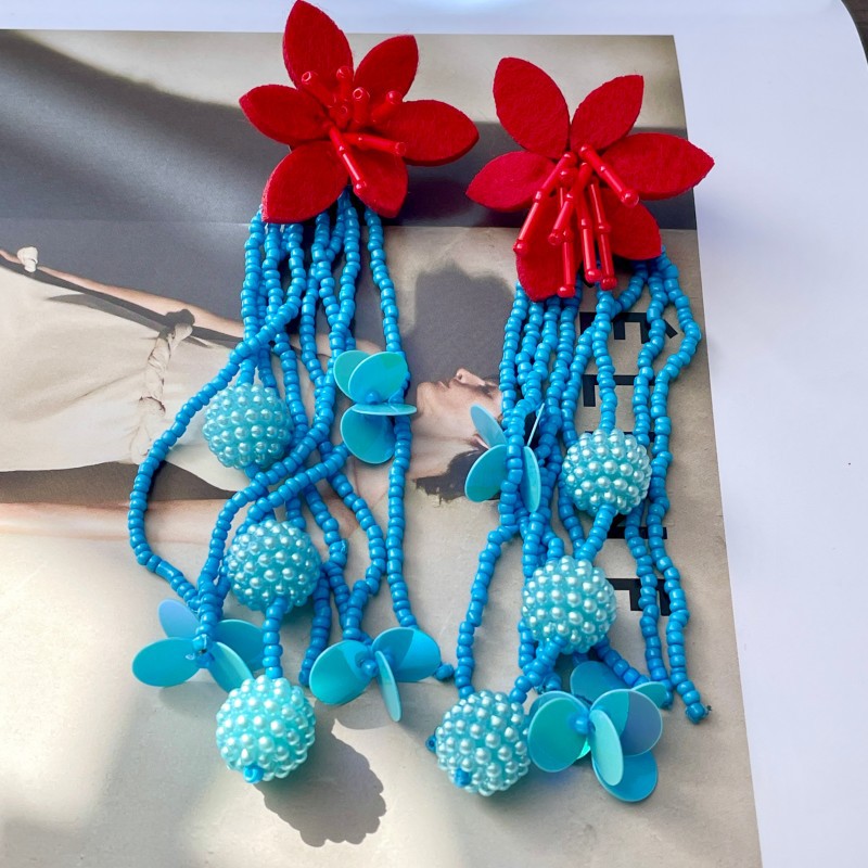 Color: 2504093 red and blue contrasting flower tassel earrings (s925 silver needle)