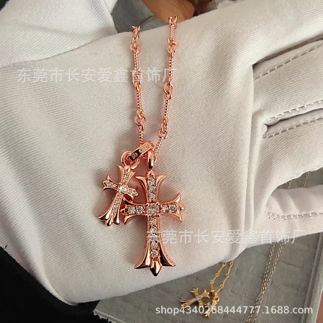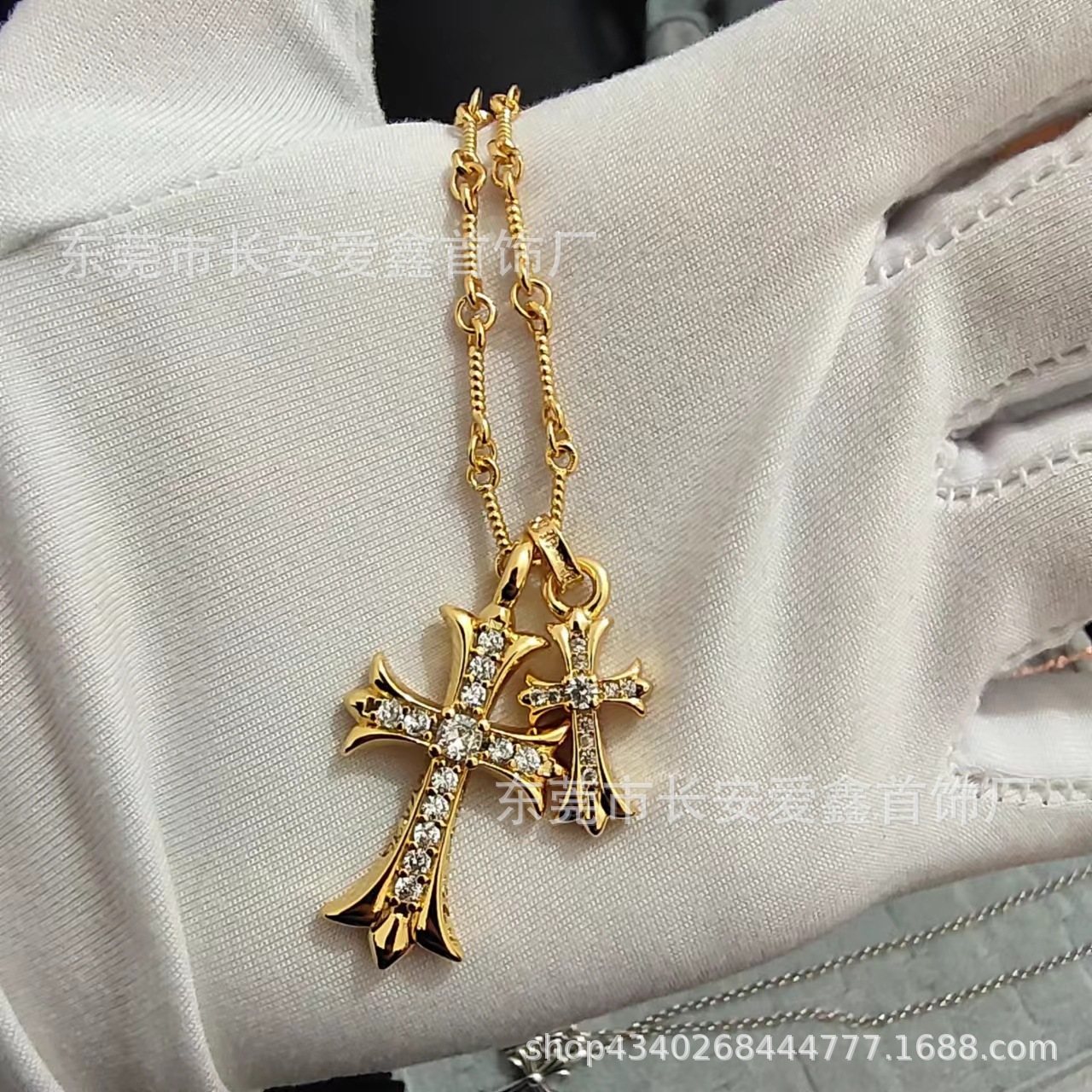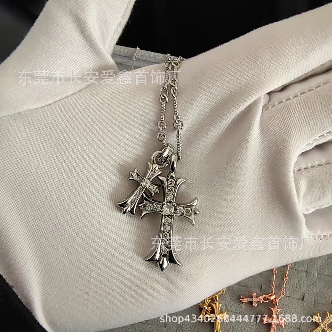 Crouchun's New Full Diamond Double Cross Necklace Retro Couple Sweater Chain Sydney Same Style Jewelry Versatile Sexy
