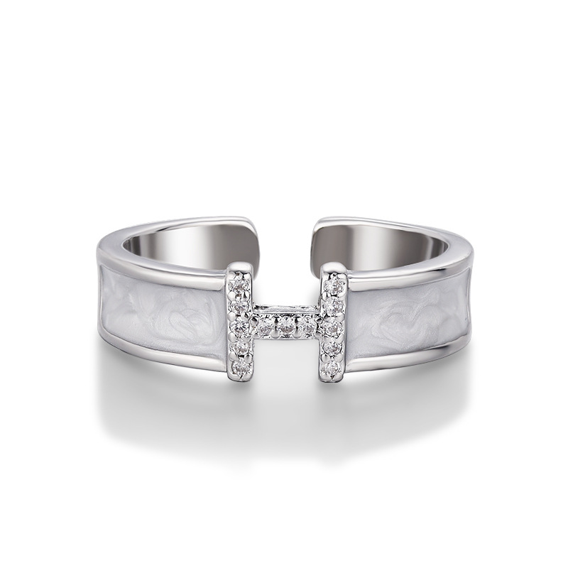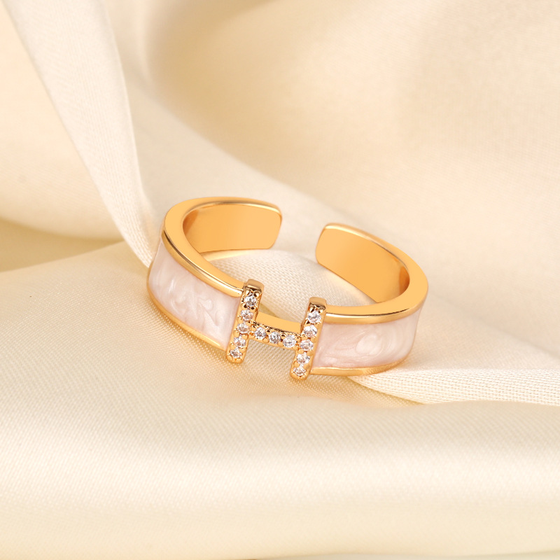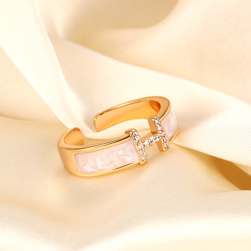 Korean Version Seiko White Mother-Of-Pearl H Letter Ring for Women, Fashionable Light Luxury Niche Design Adjustable Open Ring