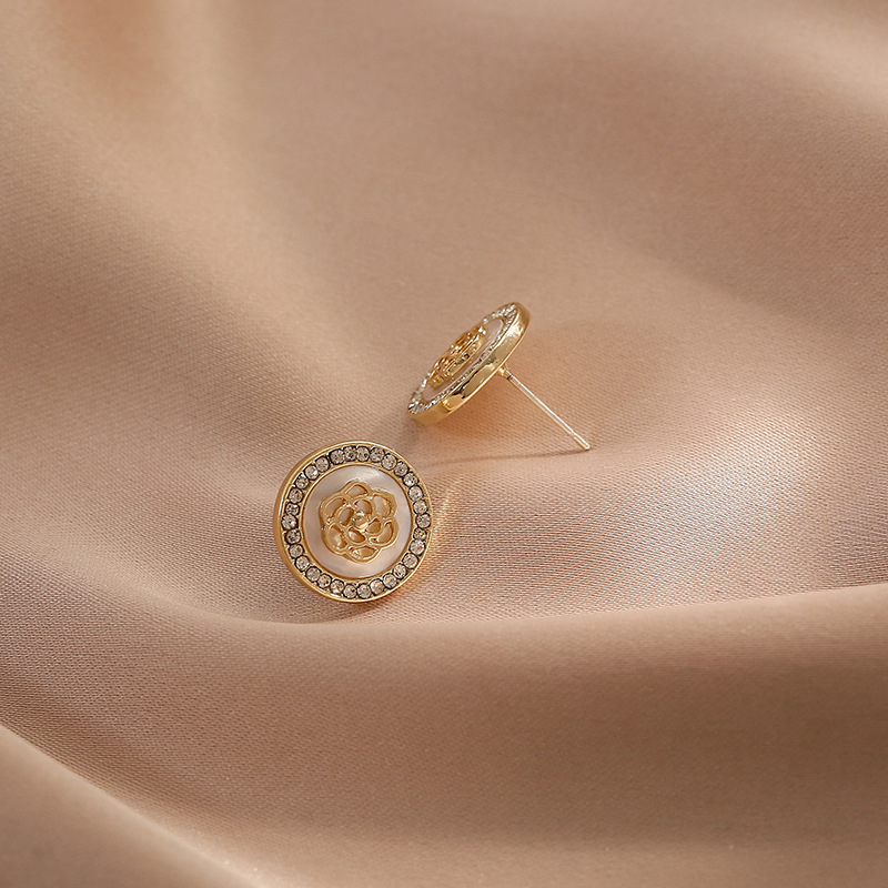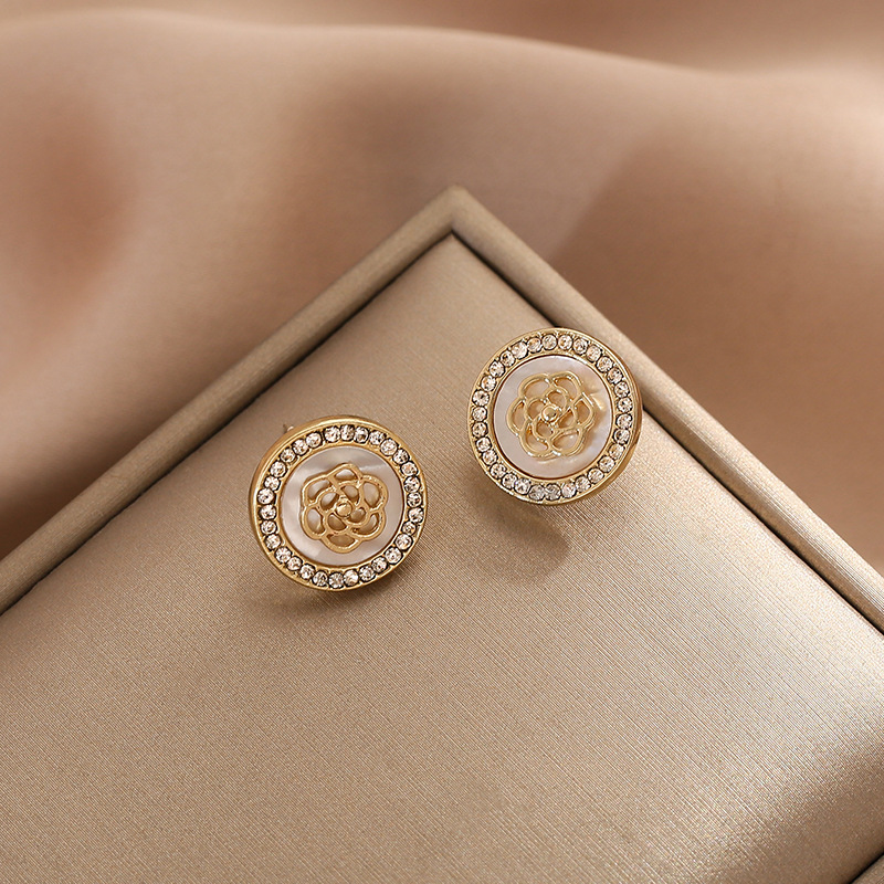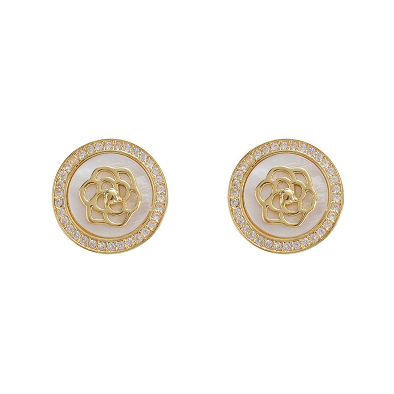Vintage Round Camellia Ear Stud White Elegant Earrings Women's Personality Full Diamond All-match Series Ear Jewelry