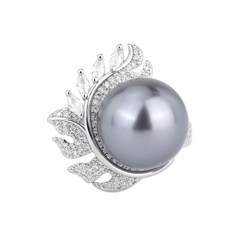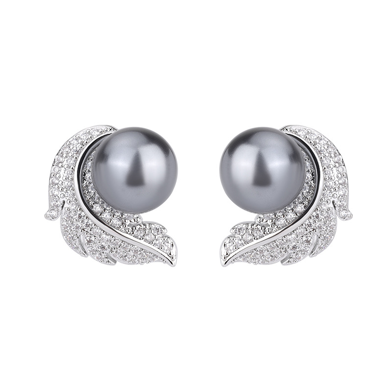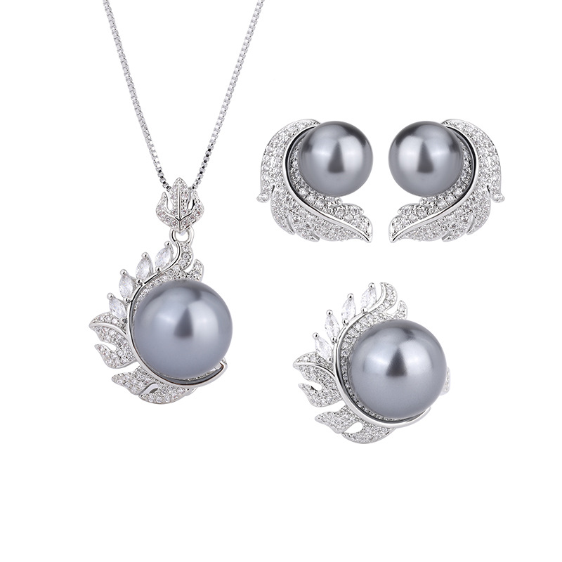 Korean Style Jewelry Set Feather Grey Pearl Earrings Silver White Edge Pendant Necklace Silver White Edge Ring Three-Piece Set for Women