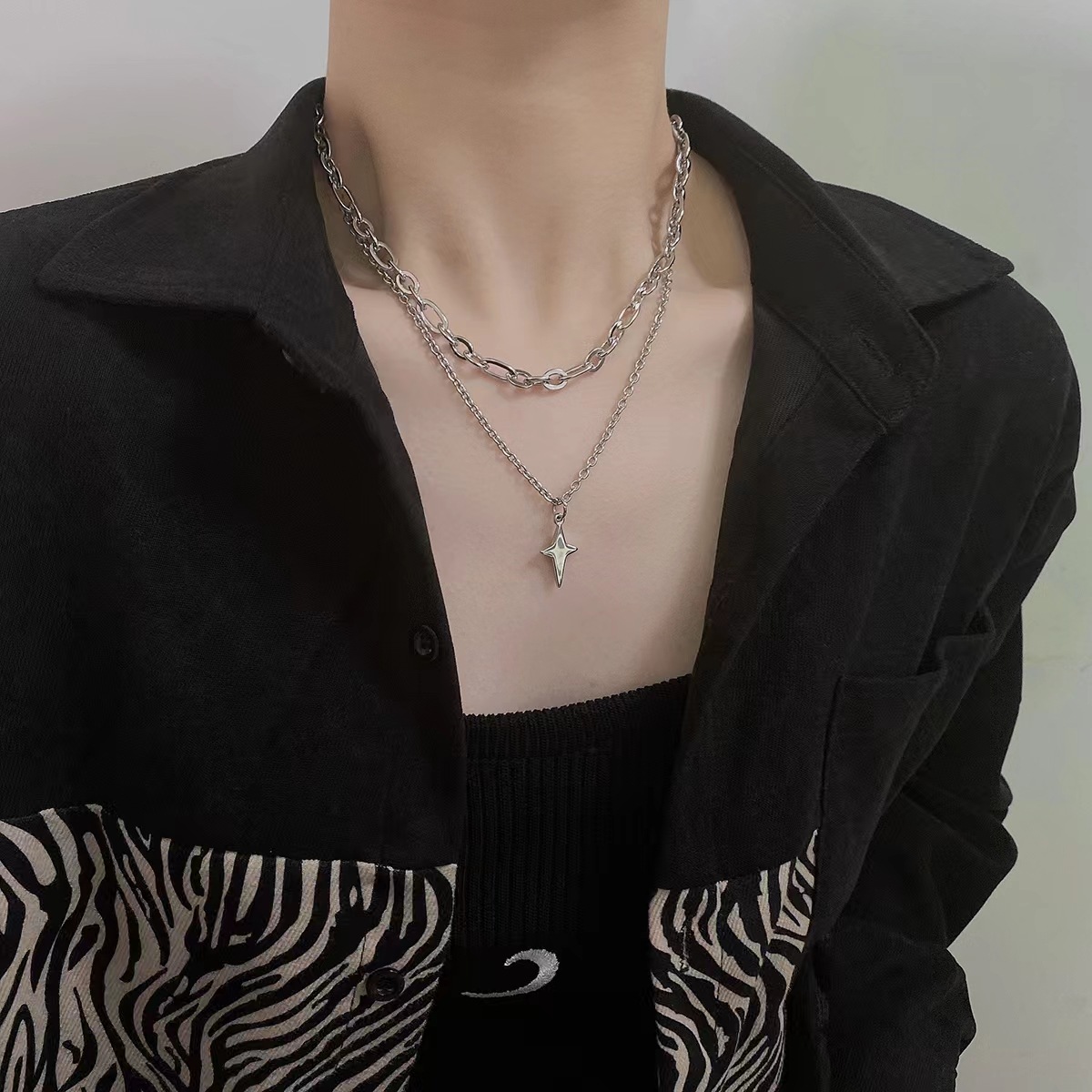 Double-layer stacked four-angle star titanium steel necklace female niche design cold style necklace simple elegant trendy clavicle chain