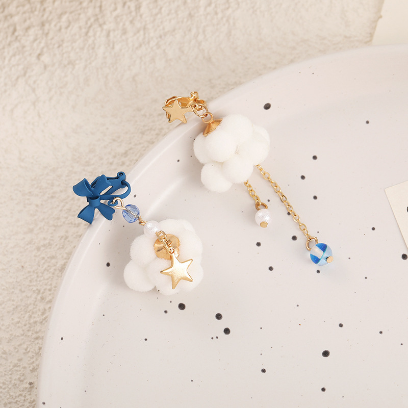 Fashion asymmetric white cloud earrings blue bow tassel earrings without pierced earrings ear clip