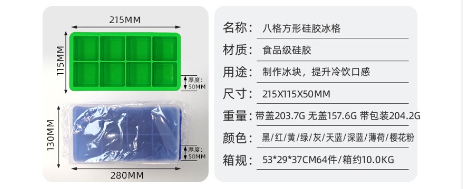 8格冰格 160.6g 盖子40g 64件/箱 49*43*38.5cm 净重12.83kg 毛重13.71kg