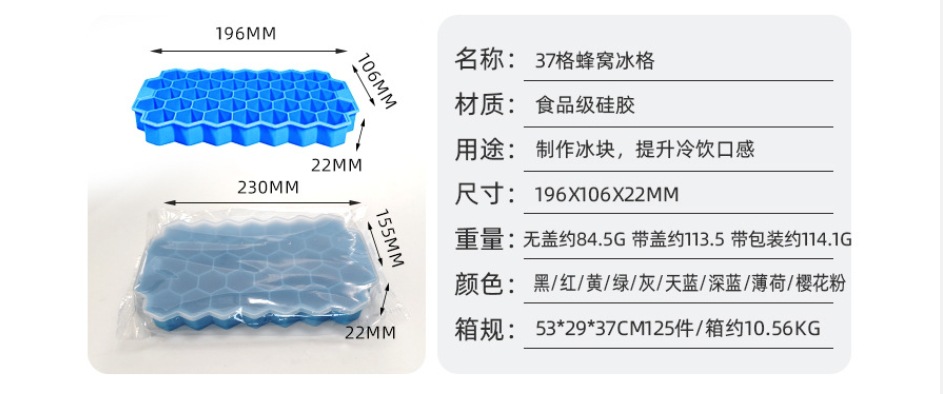 37格蜂窝冰格 84.5g 盖子28.9g 124件/箱 49*43*38.5cm 净重10.47kg 毛重11.35kg