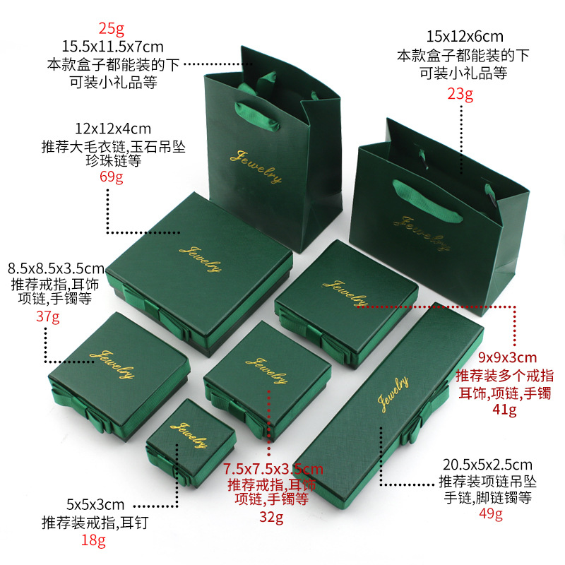 Specifications and models: Seven-piece necklace box with dark green bow on the side; dark green handbag 23x7x21cm