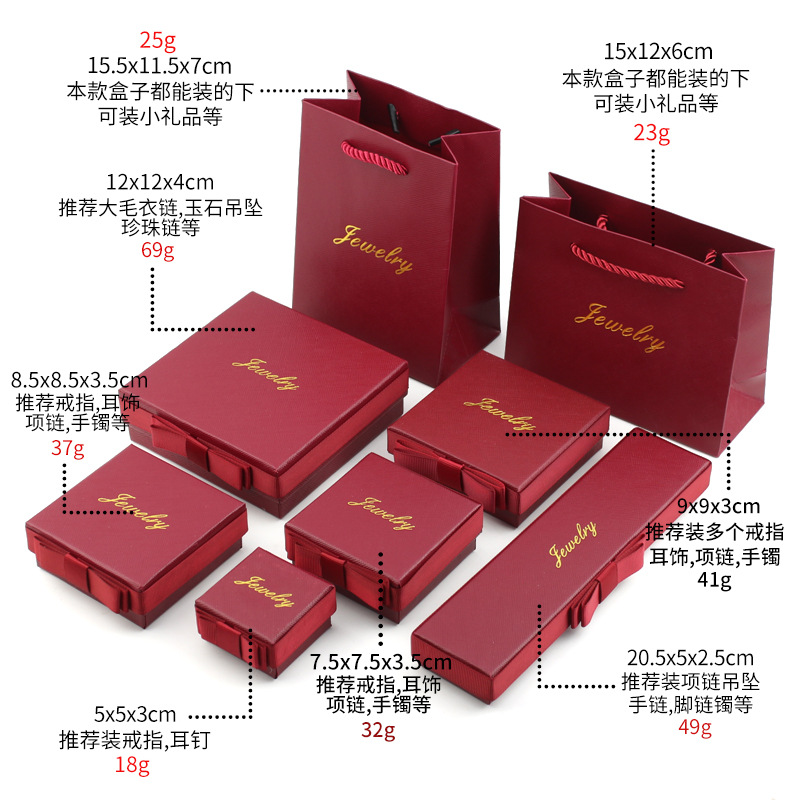 Specifications and models: Seven-piece necklace box with bordeaux bow on the side; bordeaux handbag 23x7x21cm