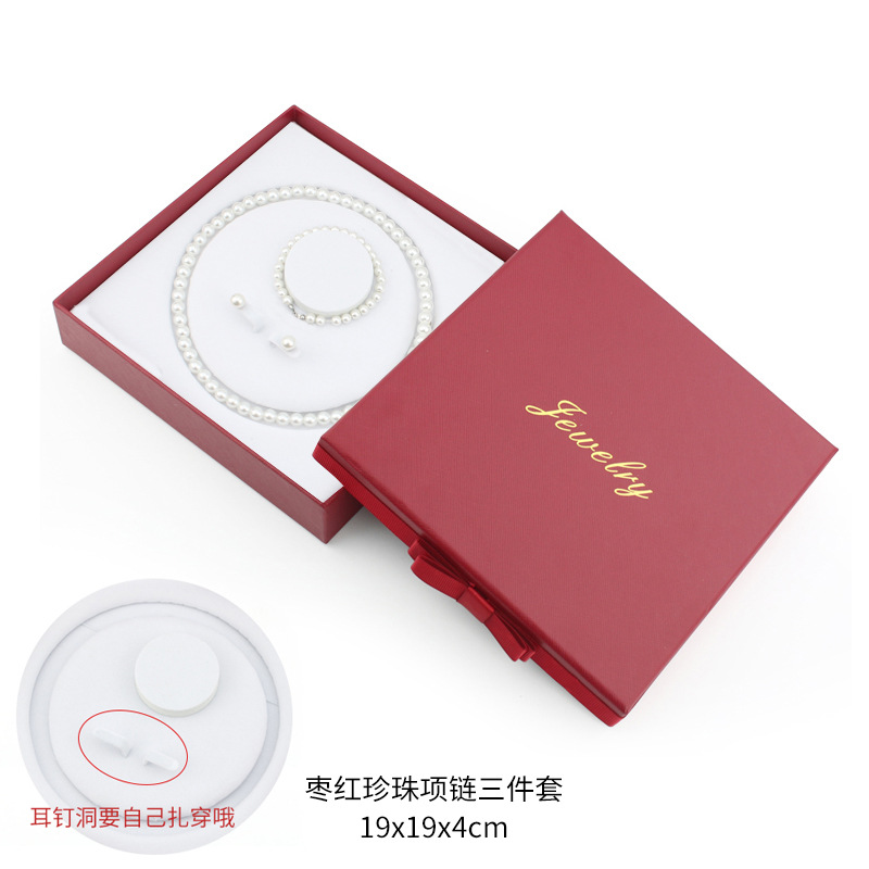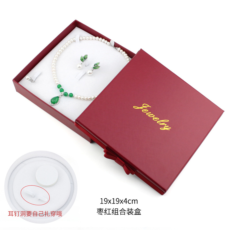 Specifications and models: Three-piece necklace box with bordeaux bow on the side; 19 × 19 × 4cm