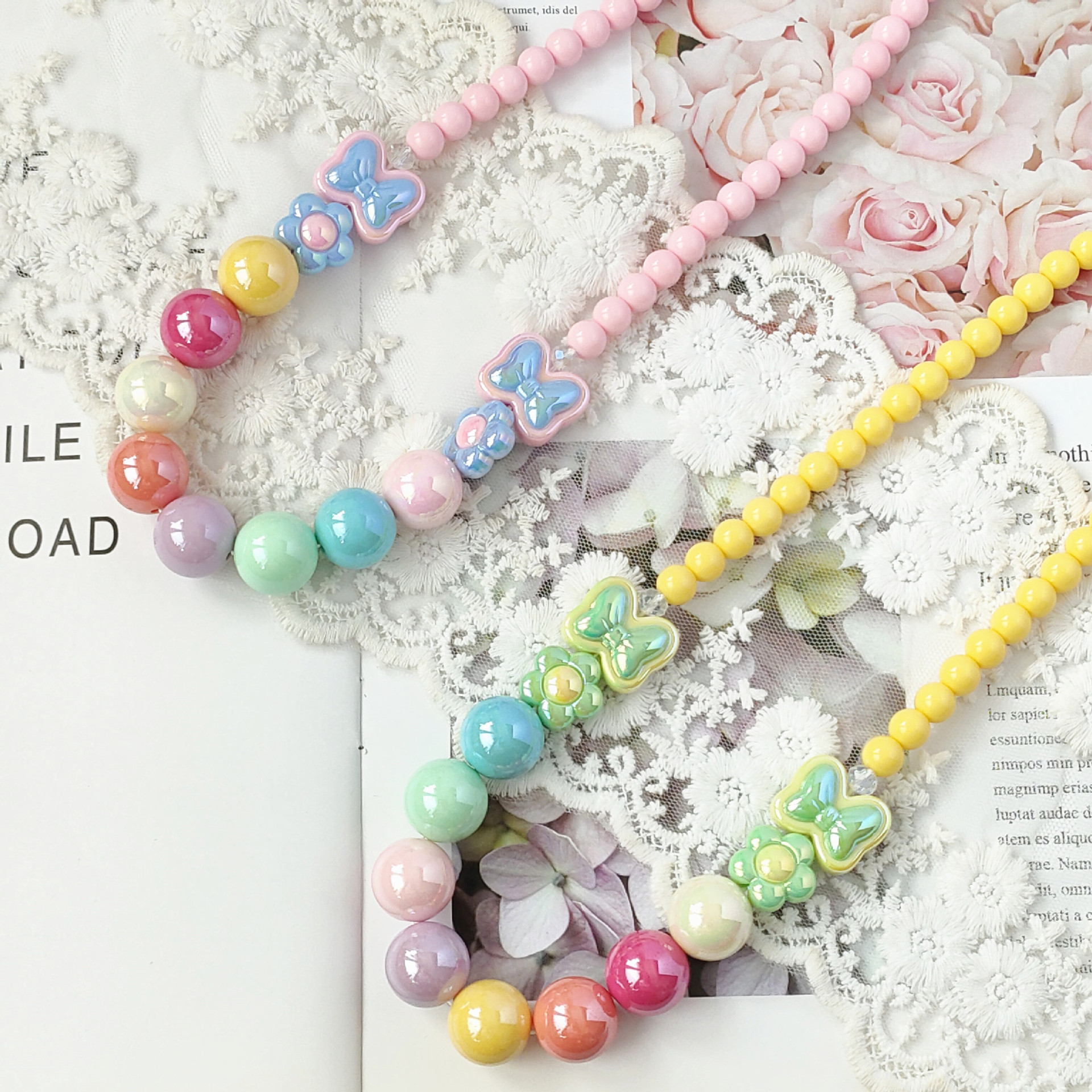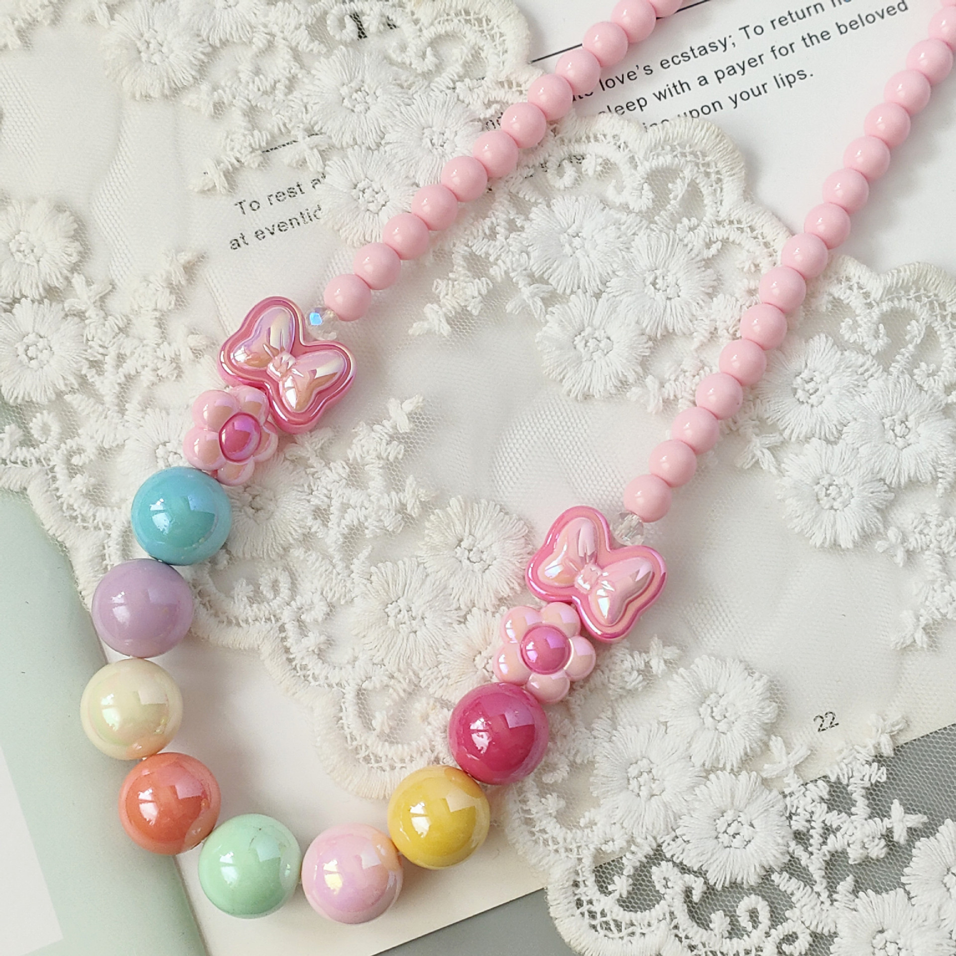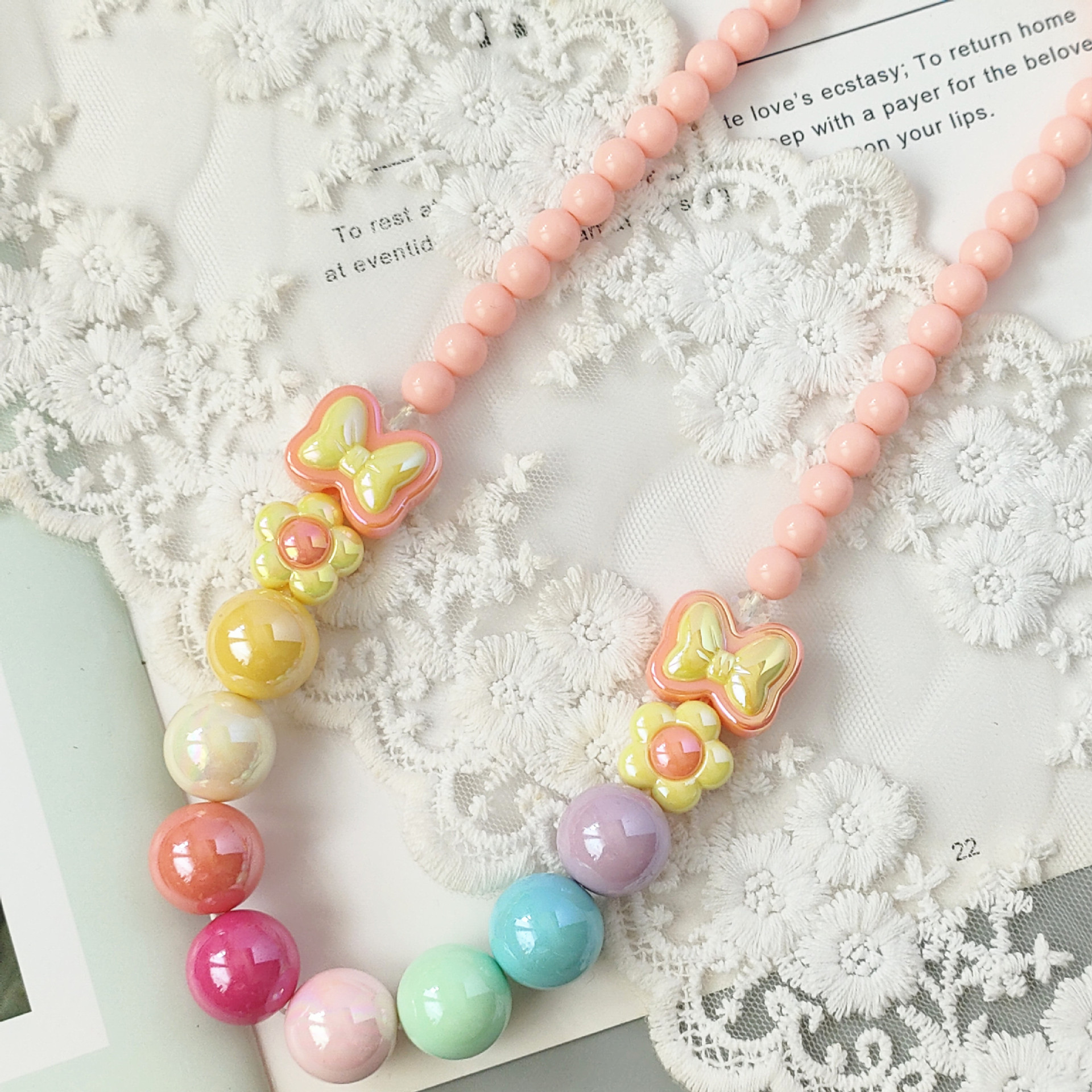 New children's sweet cute bow flower necklace bracelet student colorful shiny beaded acrylic jewelry