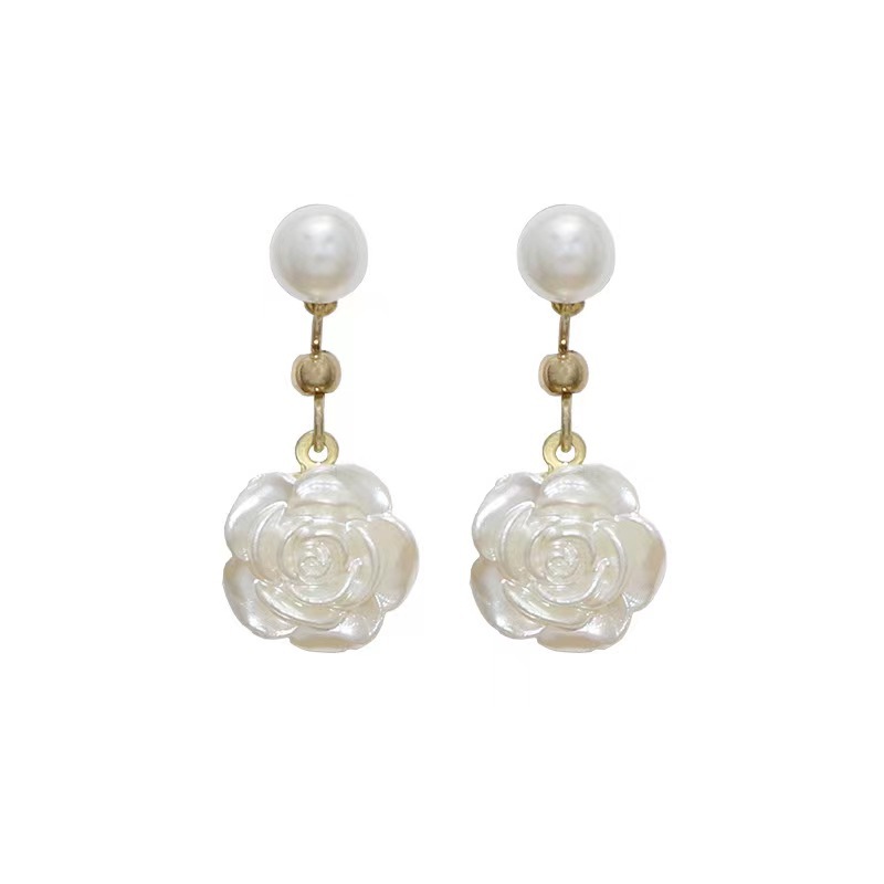 Super fairy small Camellia earrings ~ pearlescent white rose pearl earrings women's temperament early spring new ear clip tide