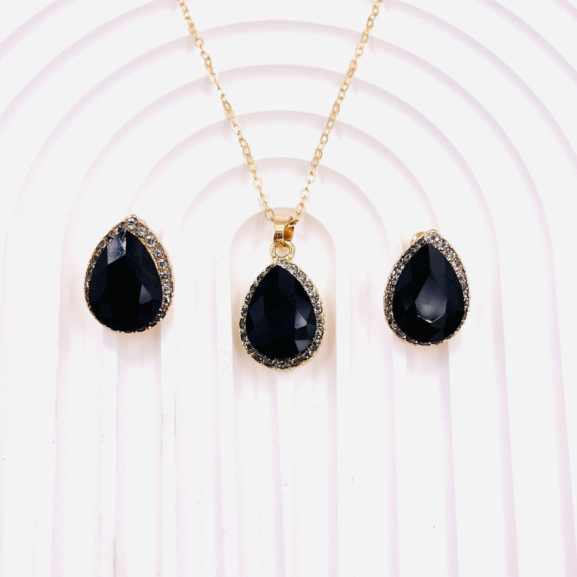 Color: Water Drop Gem Necklace Earrings Set-Black