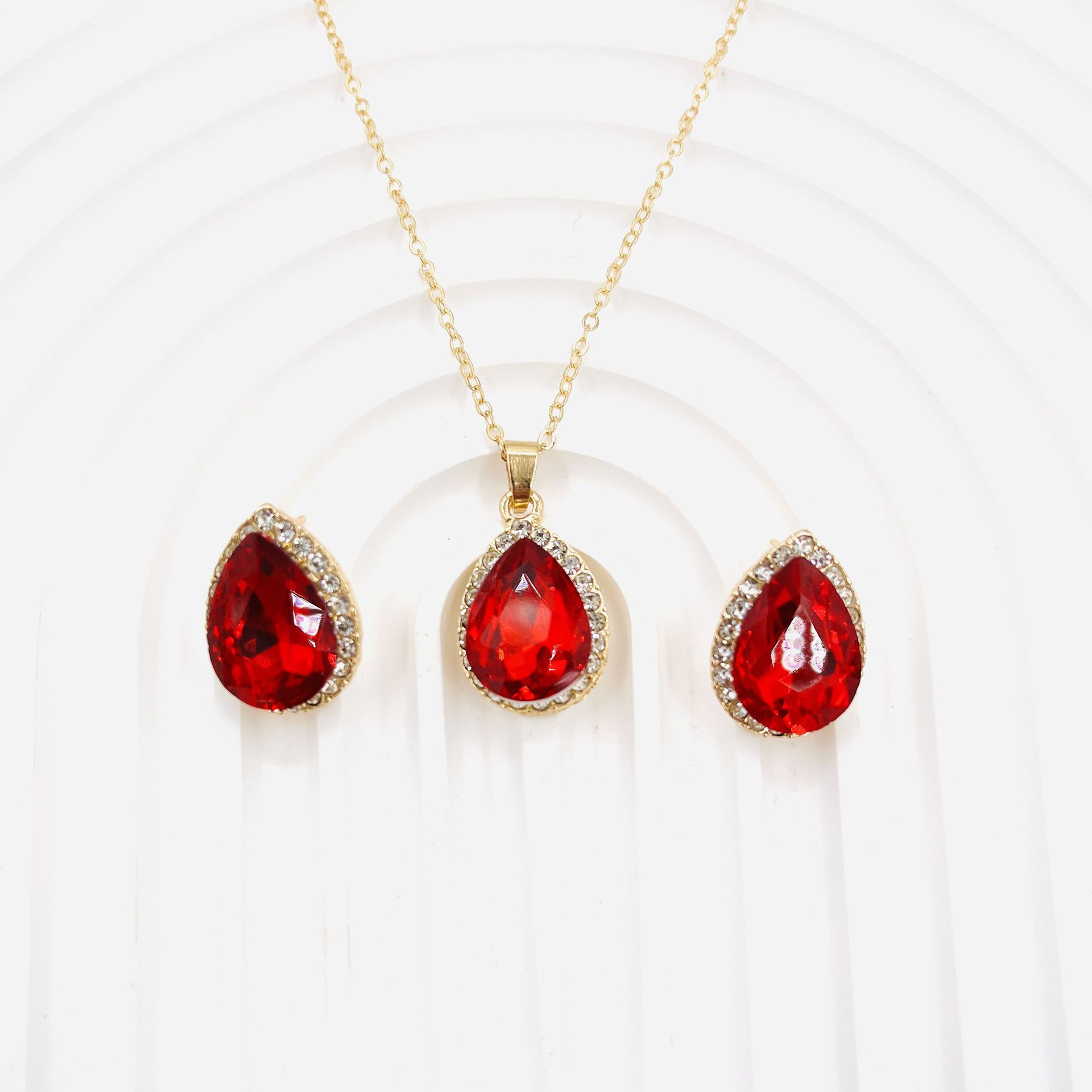 Color: Water Drop Gem Diamond Necklace Earrings Set-Red