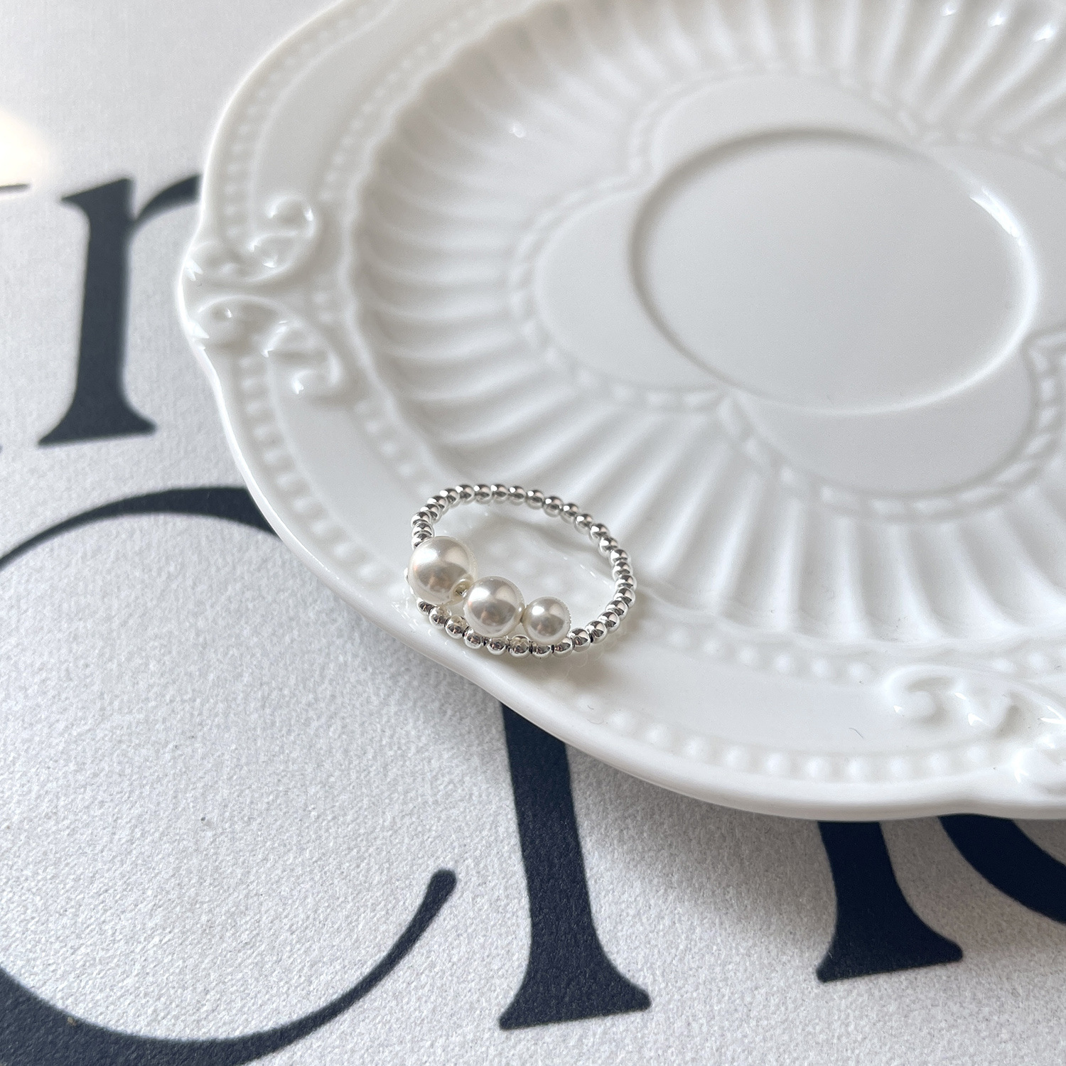 S925 Sterling Silver Austrian Shijia Pearl Ring Women's Exquisite Niche Design Open High-end Light Luxury Silver Beads
