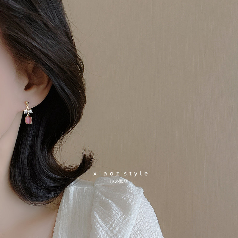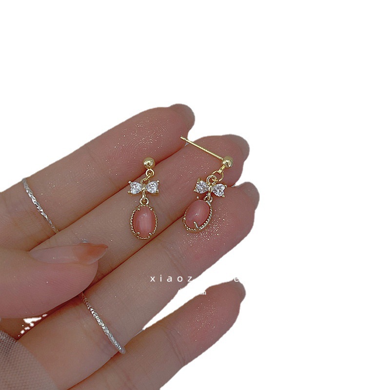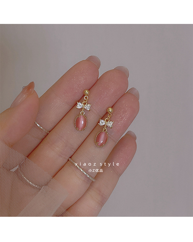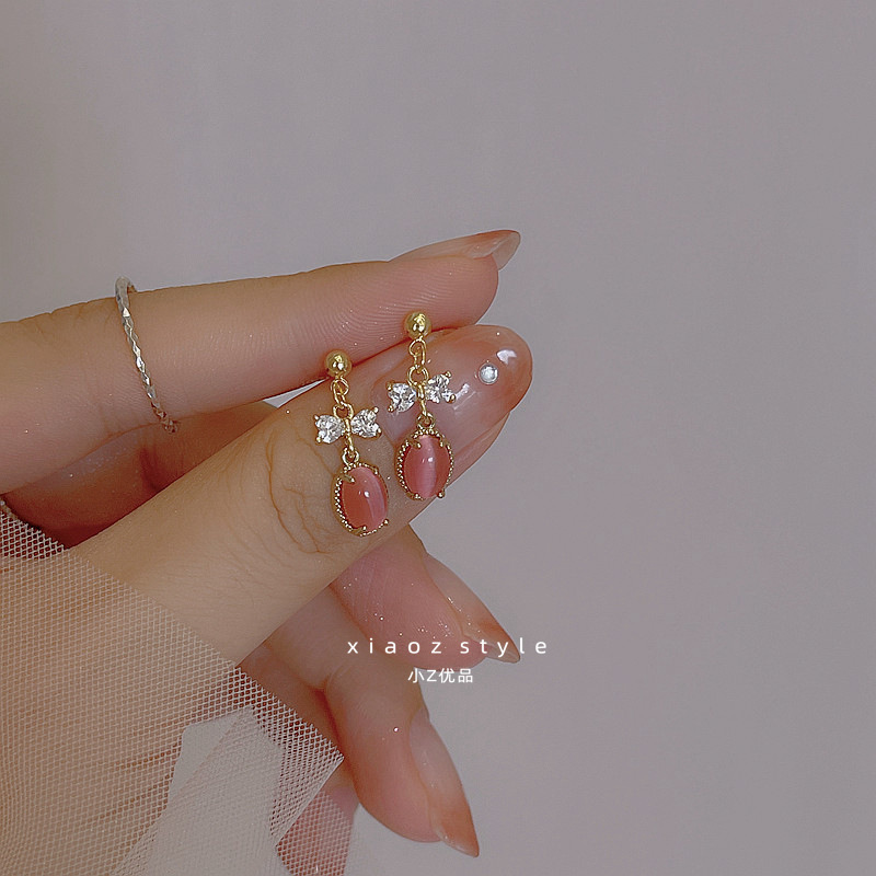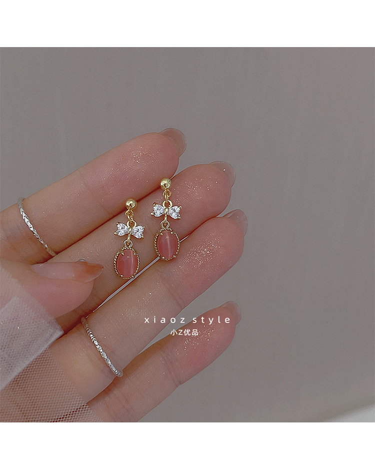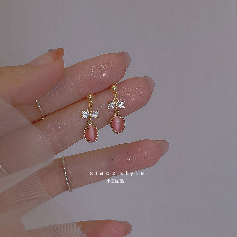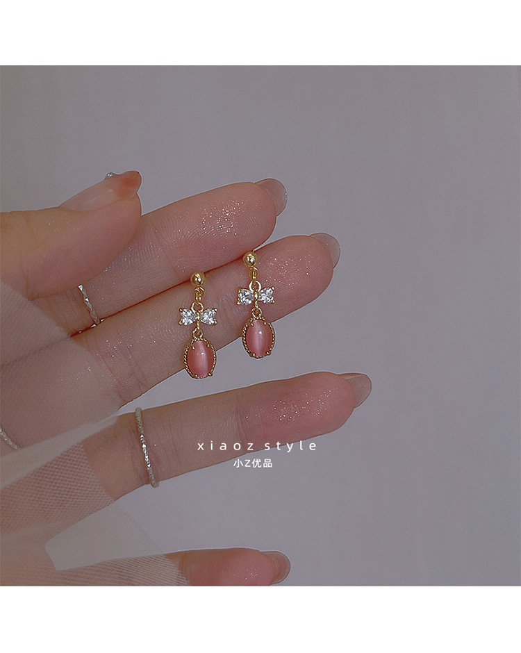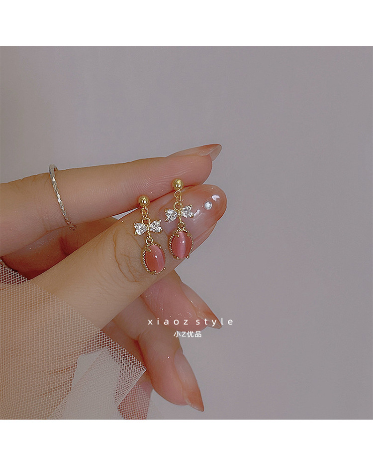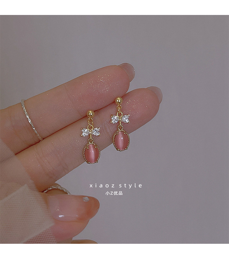 925 Silver Ear Needle Plated with 14K Gold Micro-Paved Zircon Pink Cat's Eye Bow Earrings Elegant Small Earrings for Women
