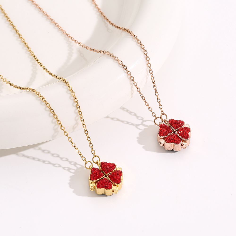 Korean Version Hot-Selling Titanium Steel Necklace for Women, Double-Wear Diamond-Encrusted Red and Black Heart Four-Leaf Clover Pendant, High-End Clavicle Chain Jewelry