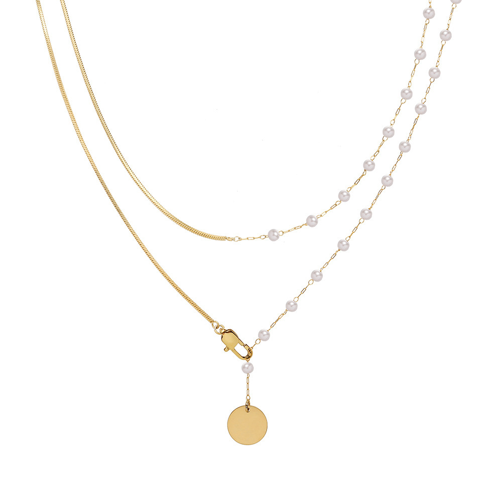 Niche Superior 18K Gold Plated Double Layer Snake Bone Pearl Necklace Women's Tassel Disc Clavicle Chain Summer 2024