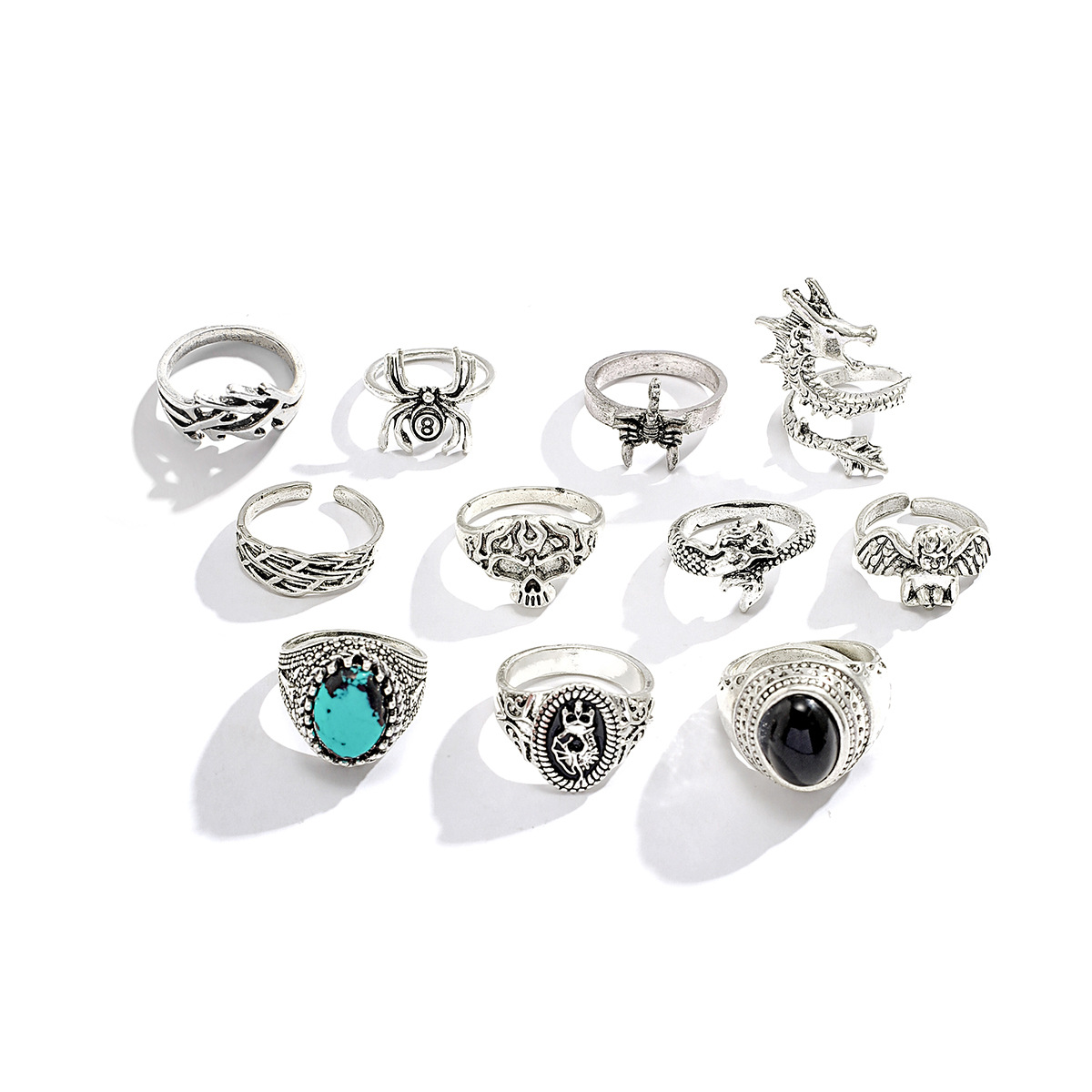 European and American cross-border personalized retro men's 11-piece turquoise gem multi-element ring suit stacked mix and match