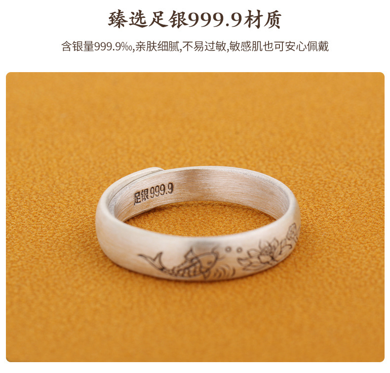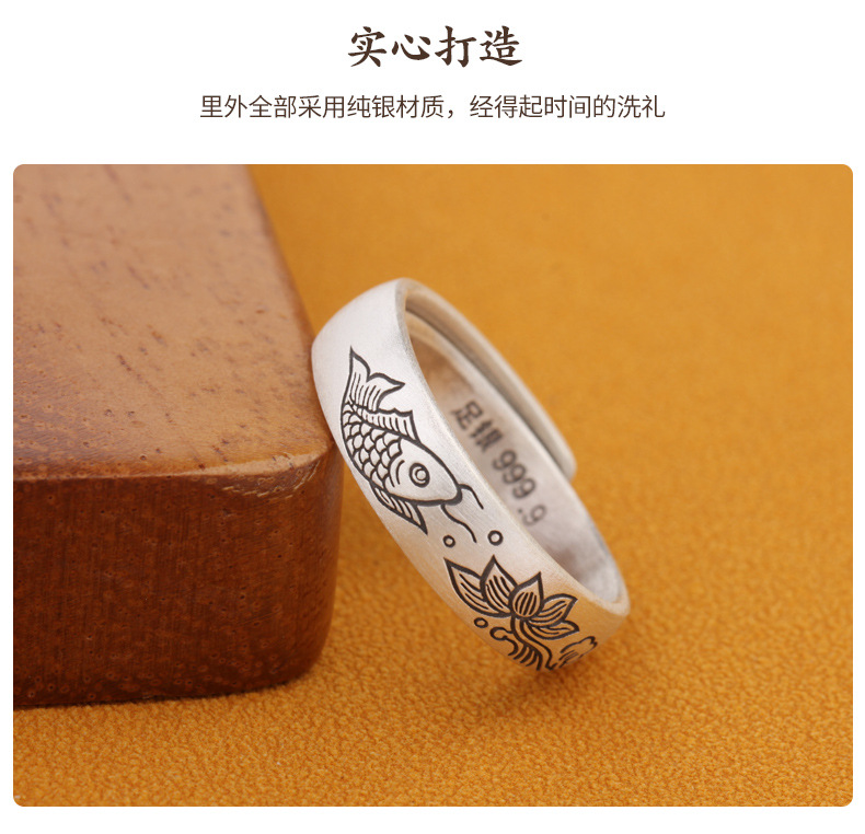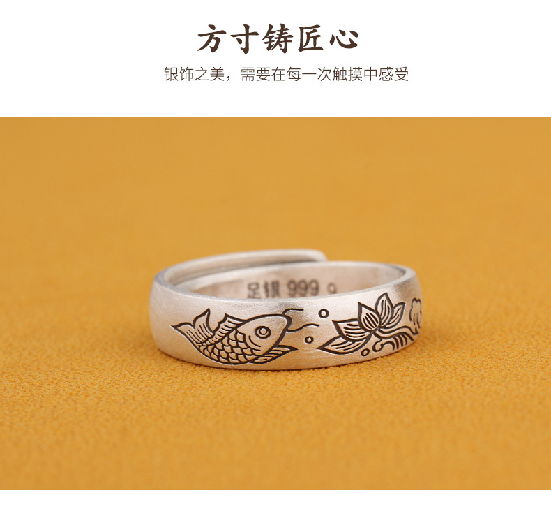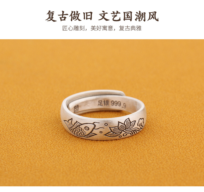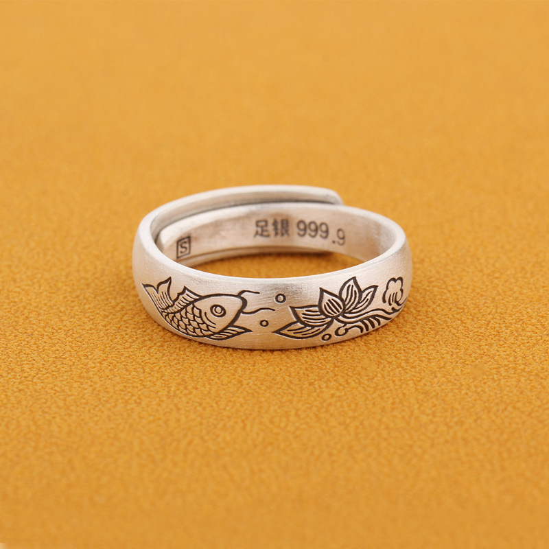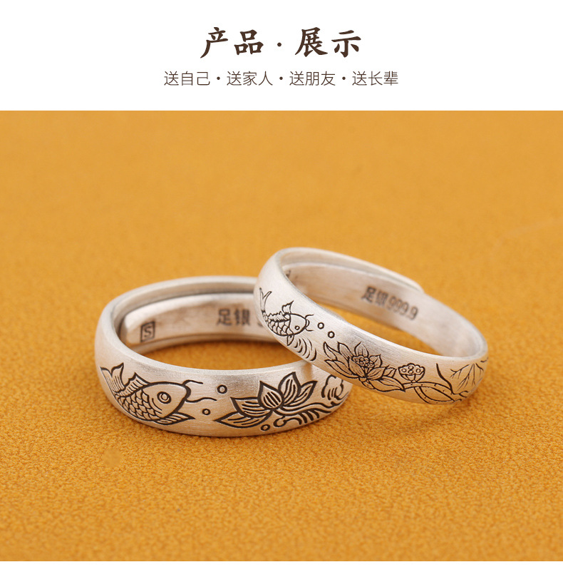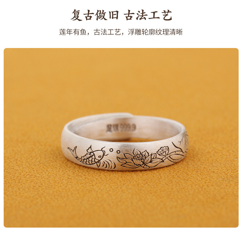 9999 Foot Silver Ring Sterling Silver Couple's Ring for Men and Women Retro National Tide Ethnic Style Lotus Year Fish Food Finger Ring