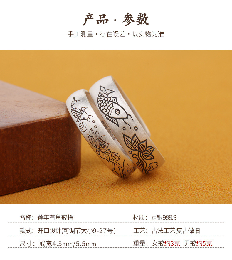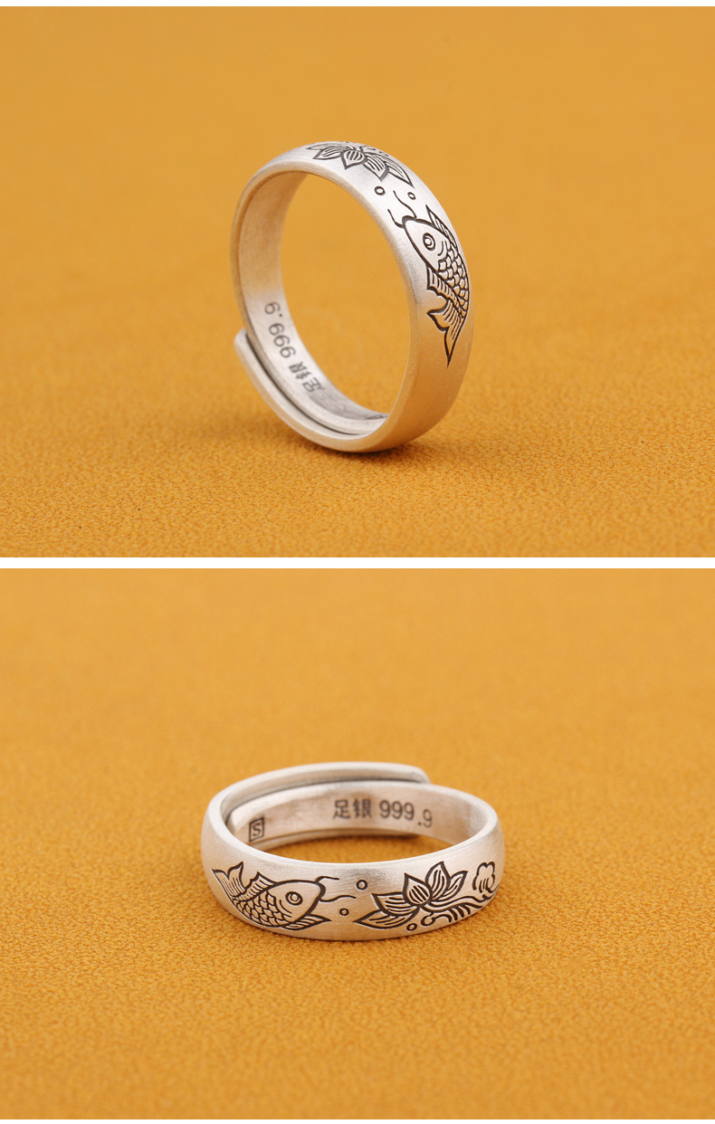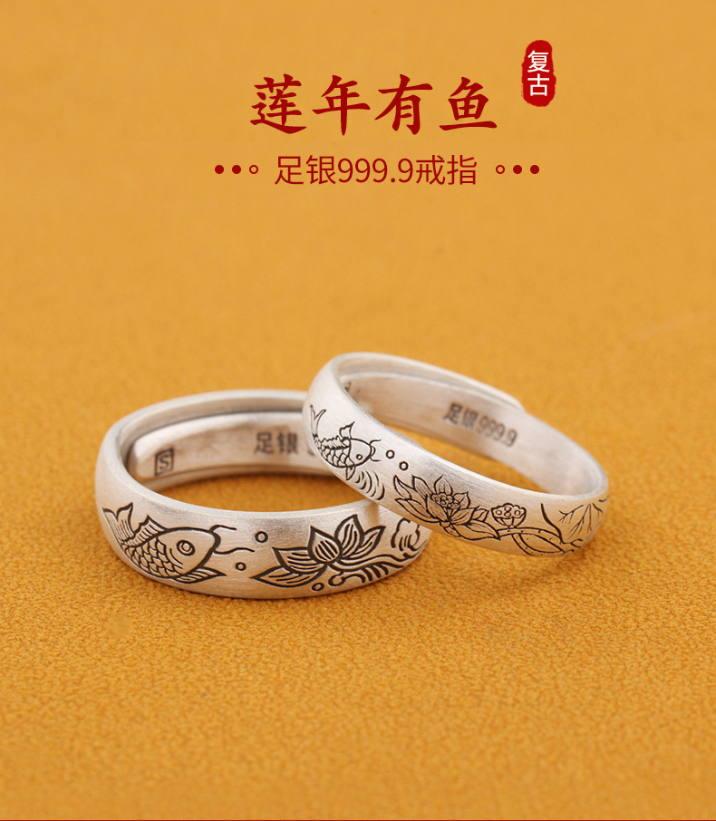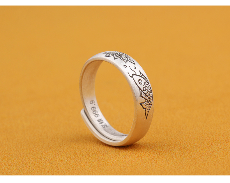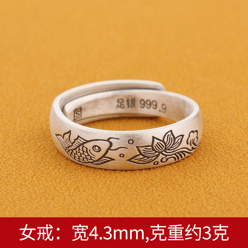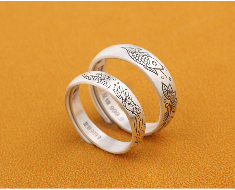 9999 Foot Silver Ring Sterling Silver Couple's Ring for Men and Women Retro National Tide Ethnic Style Lotus Year Fish Food Finger Ring