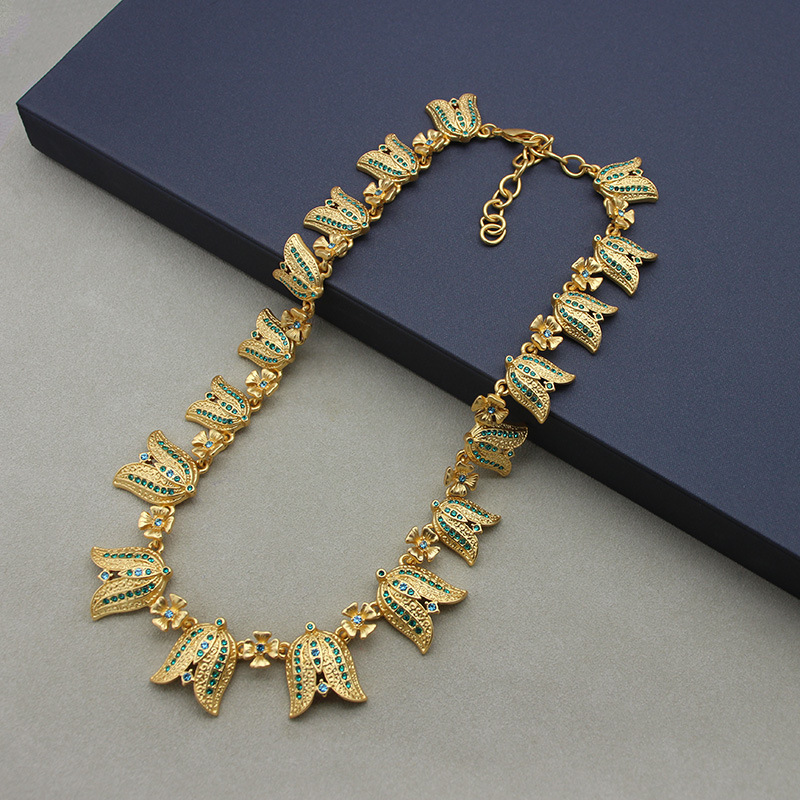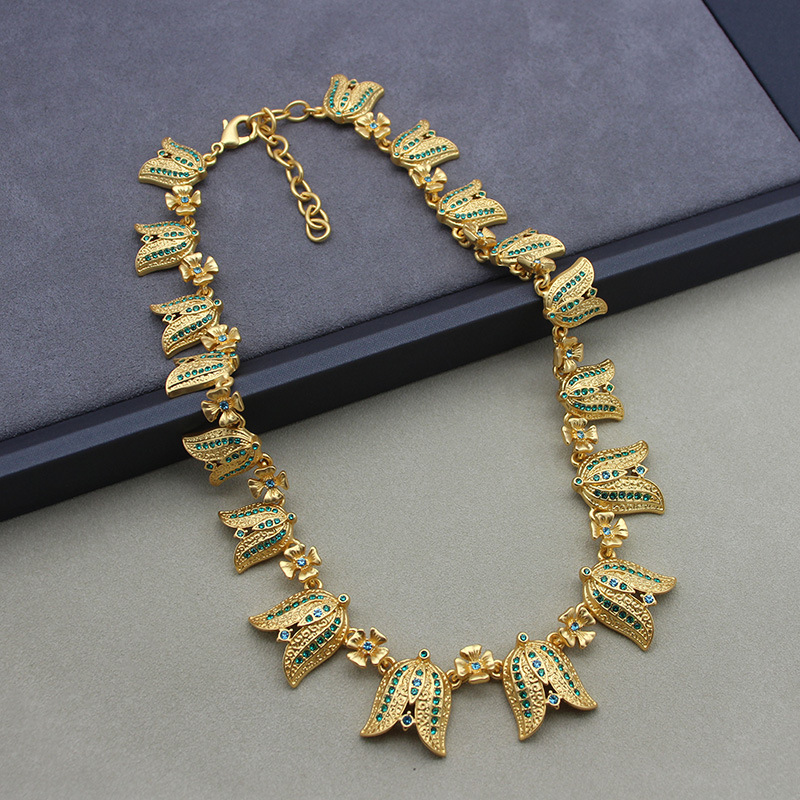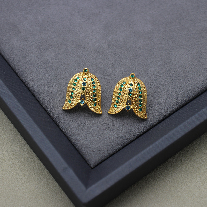 Europe and the United States Middle Ancient Lily of the Green Flower Cuifali Middle Ancient suit Earrings Necklace 24K Fog Gold Electroplated Rhine Stone Set