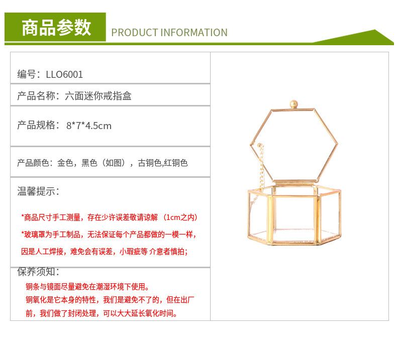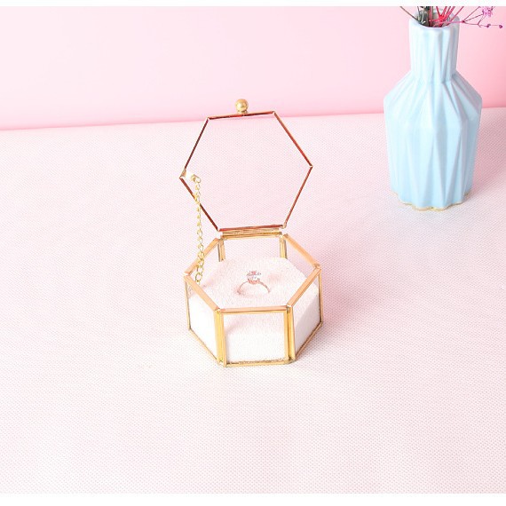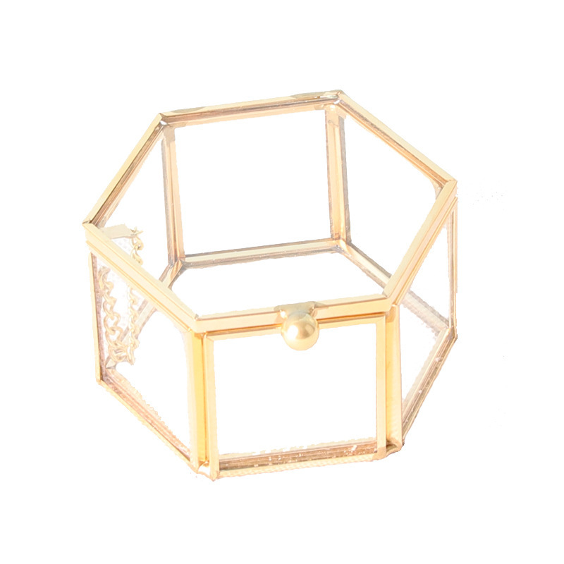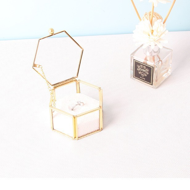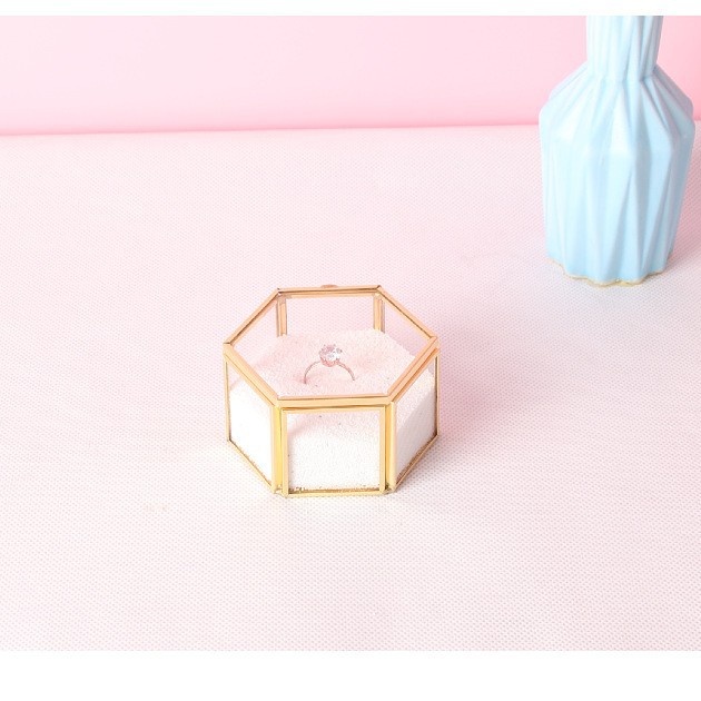 in stock Supply Transparent Mini Six-sided Ring Box Copper Strip Glass Jewelry Storage Box Wedding Hand Ring Box