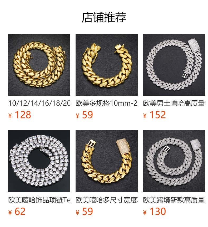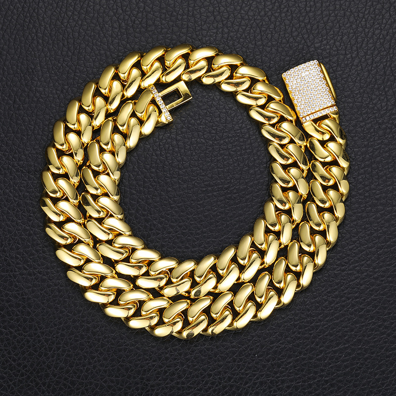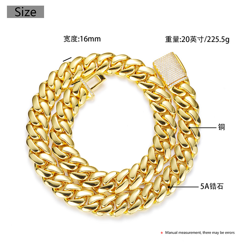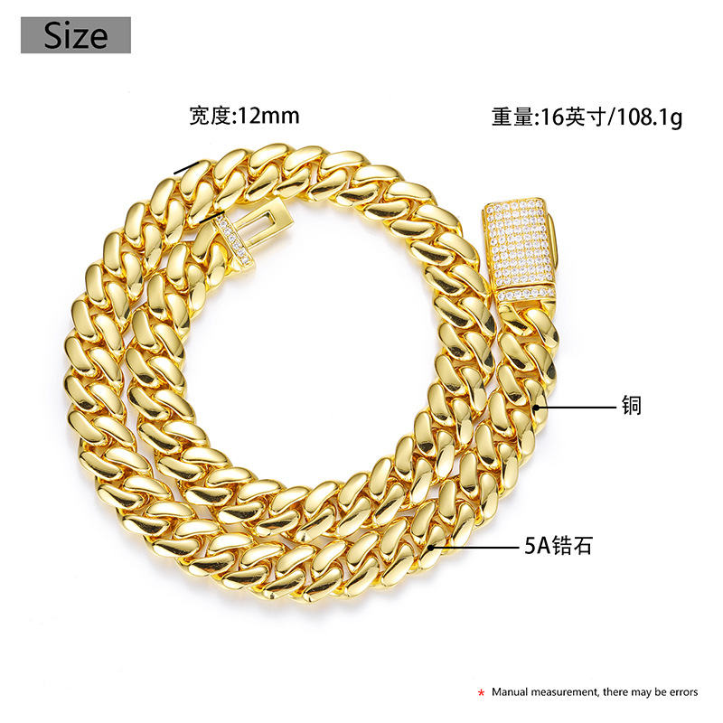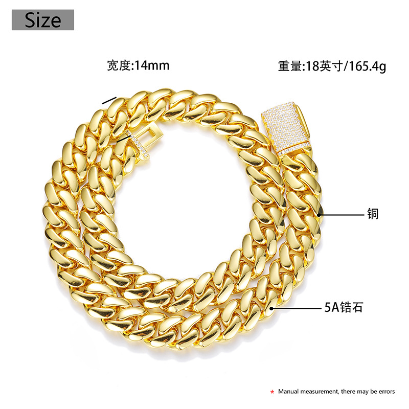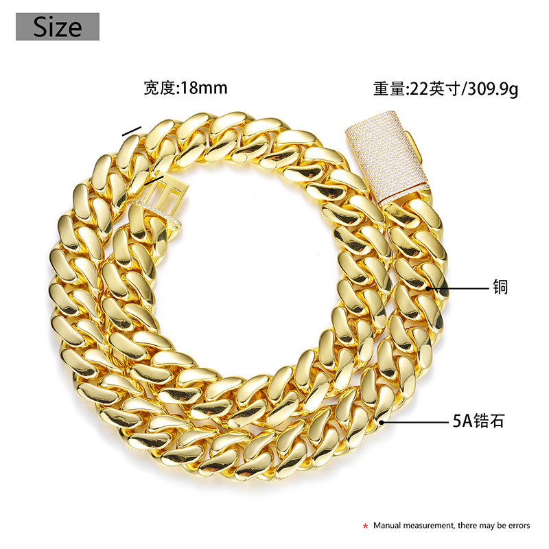 European and American Hip-Hop 5 Sizes Wide Real Gold-Plated Copper Large Cuban Chain Inlaid with Full Zircon Hip-Hop Necklace 18K