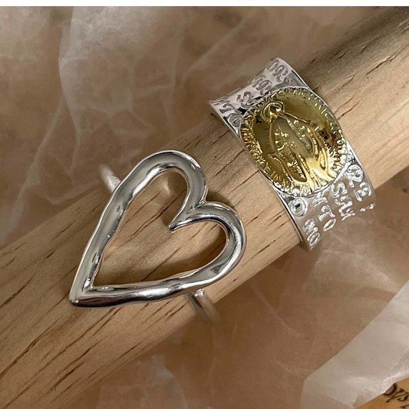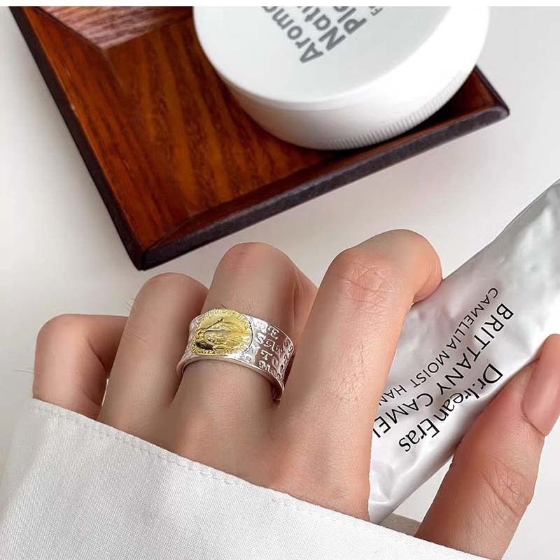 Gold and silver collision ring female Korean style ins style plain silver lovely gold coin niche retro trendy cool Open index finger ring