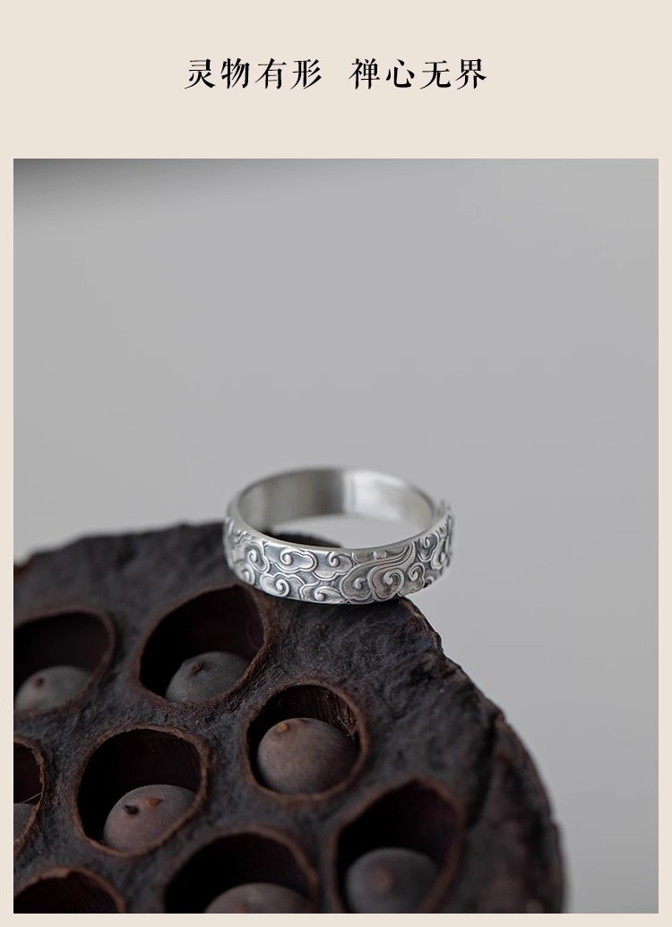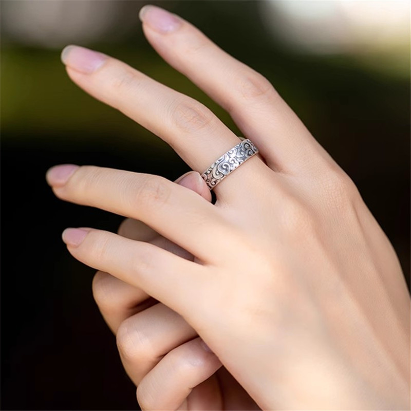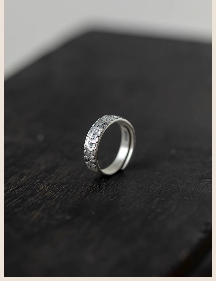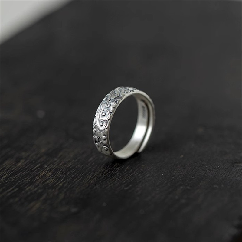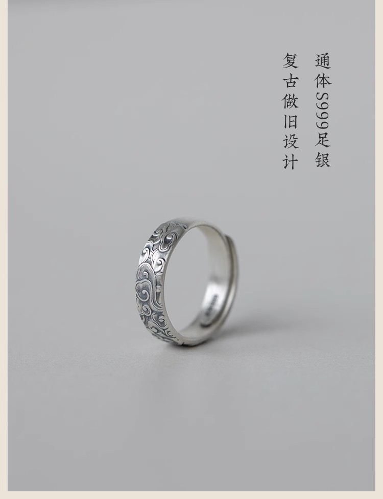 Yunyong pure silver 999 Xiangyun carved handmade clouds retro style distressed opening adjustable Wave men's ring