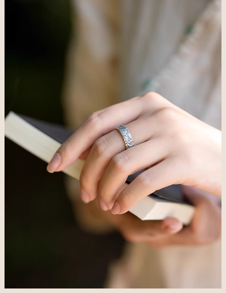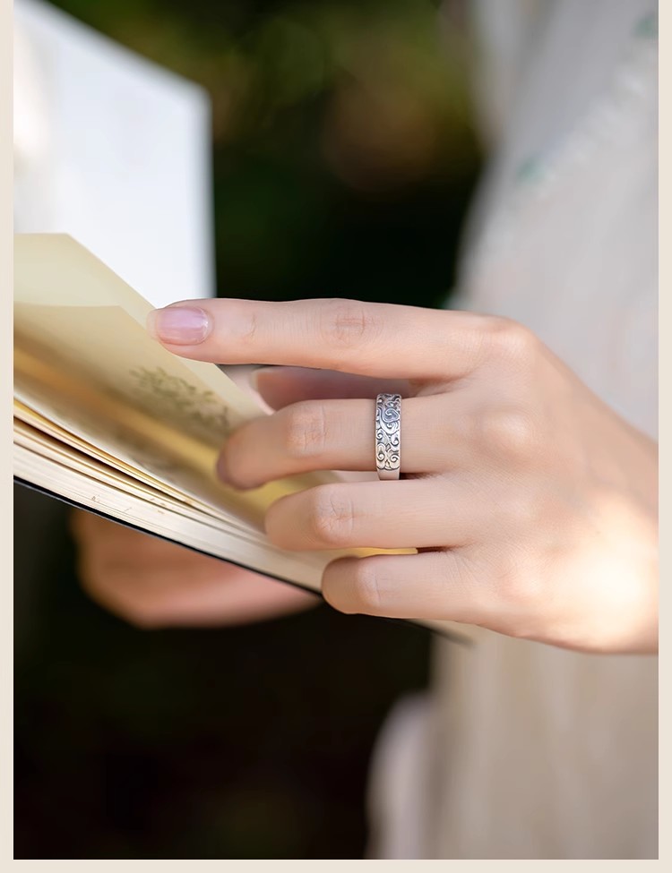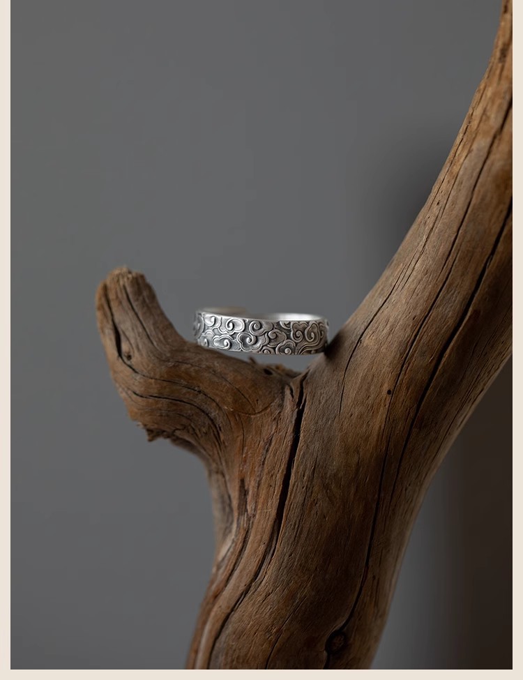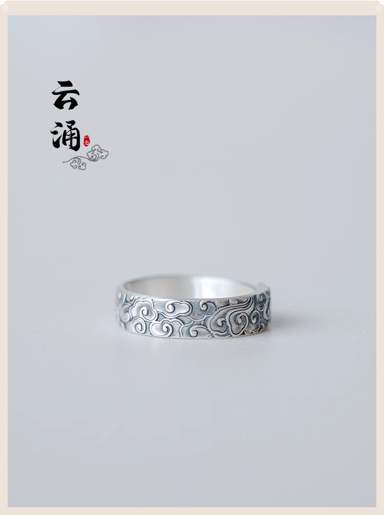 Yunyong pure silver 999 Xiangyun carved handmade clouds retro style distressed opening adjustable Wave men's ring