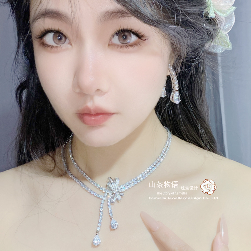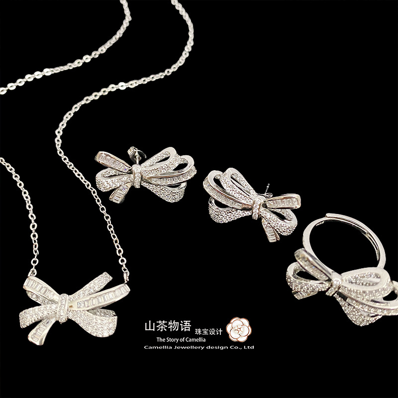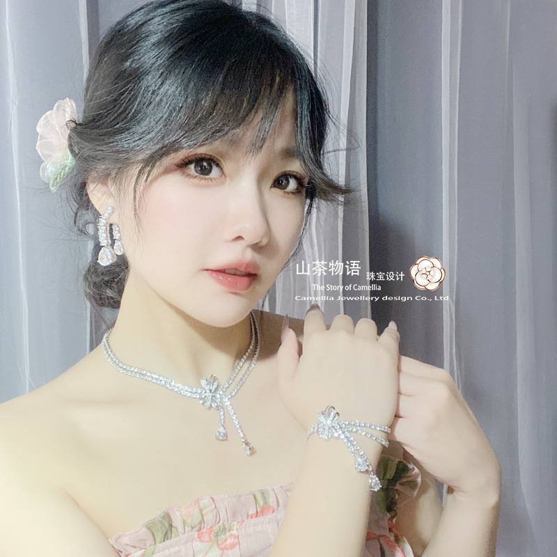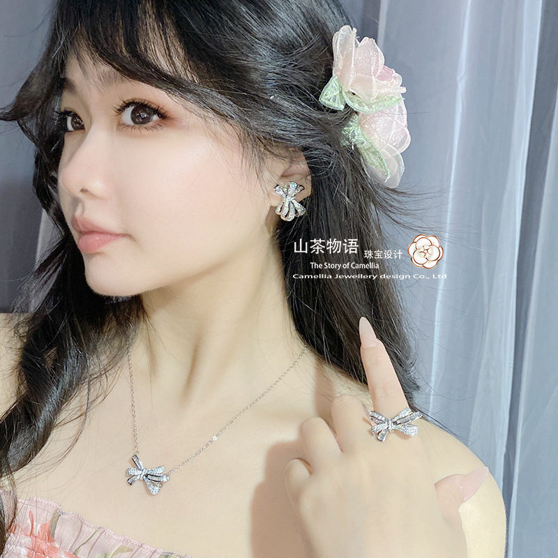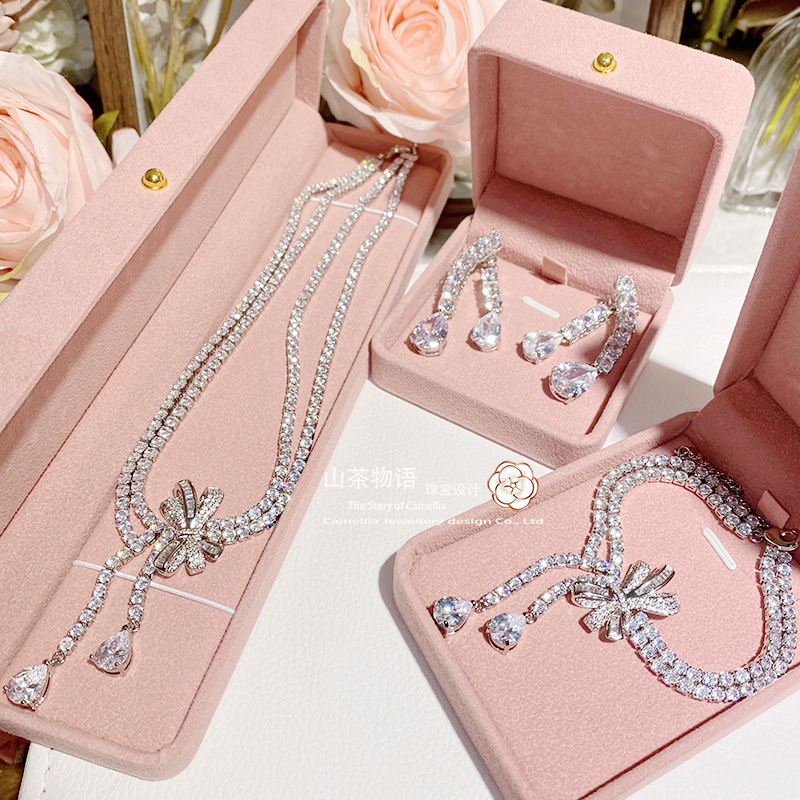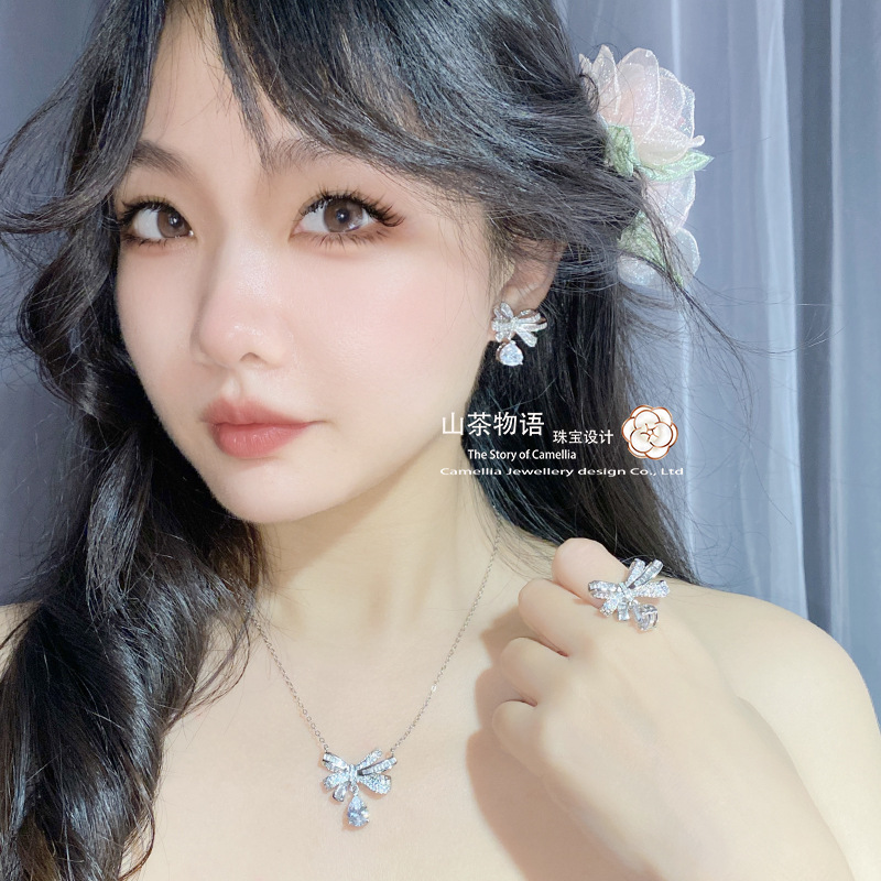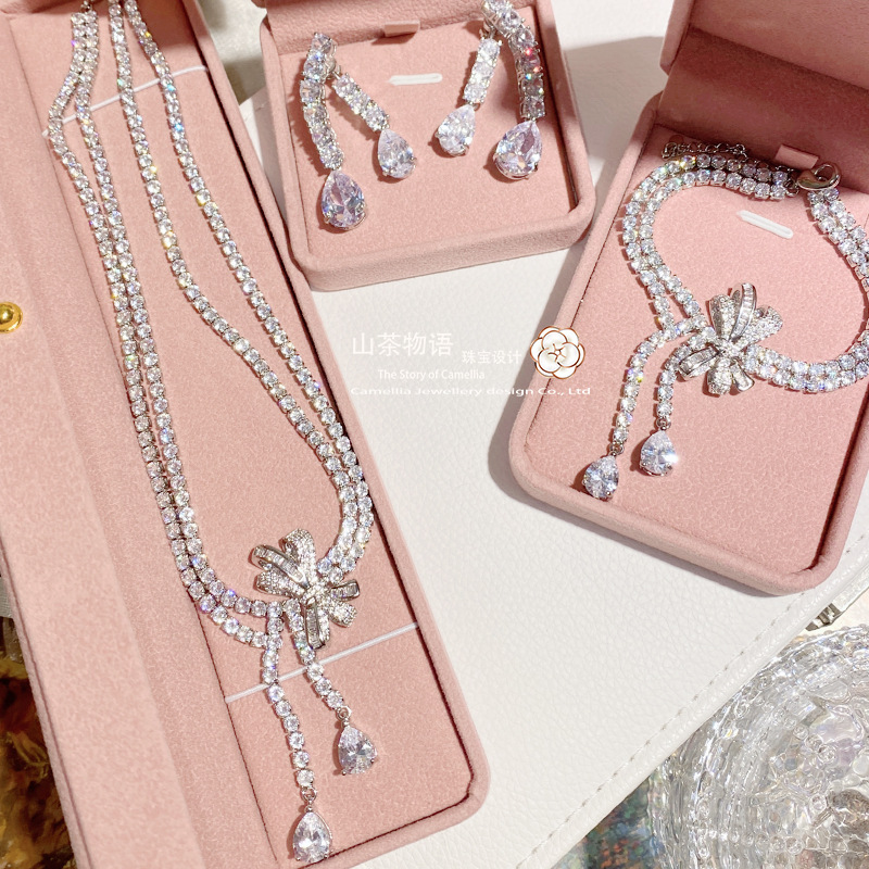 Camellia European and American fashion bow girl suit light luxury full diamond banquet occasion all-match earrings necklace
