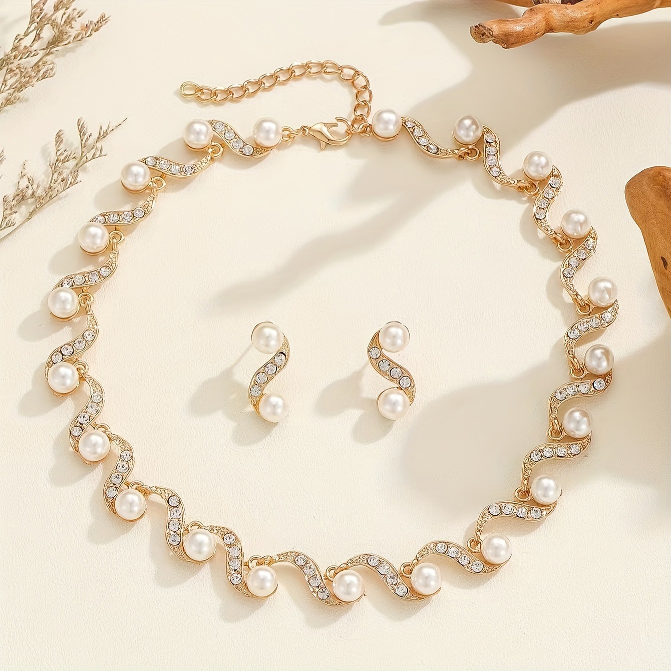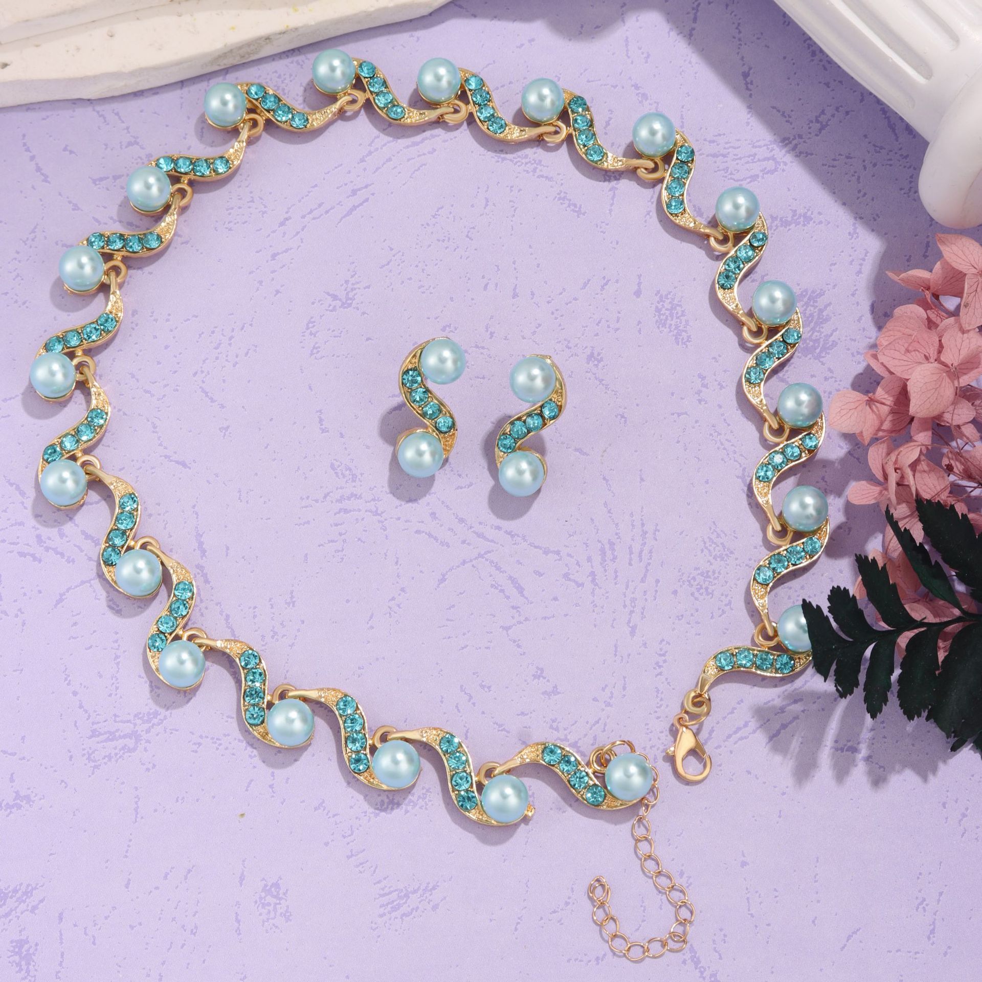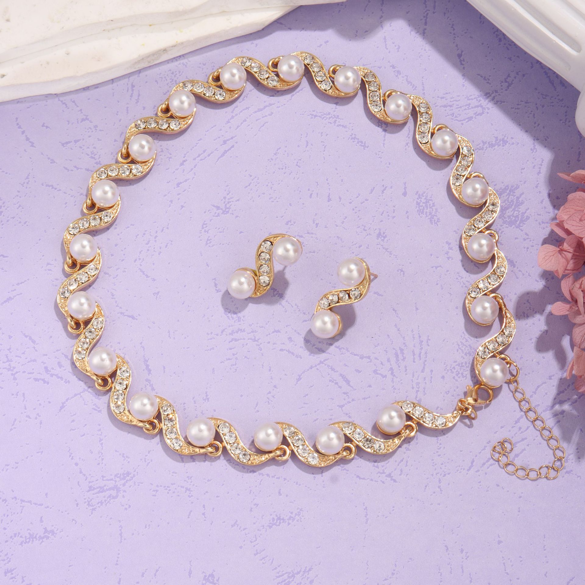 Factory Direct batch cross-border European and American Foreign trade new S-shaped alloy pearl necklace earrings Women's Light luxury niche clavicle chain