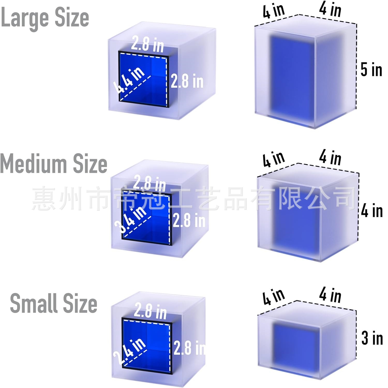 大号外部尺寸为4x 4x 5英寸,内部为2.8x2.8x4.4英寸;中等尺寸为4x 4 4英寸,内部为2.8x 2.8x 3.4英寸;外部尺寸为4x3英寸,内部为2.8x2.8x2.4英寸。