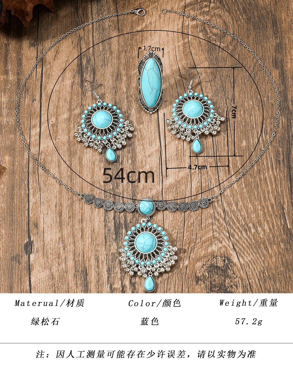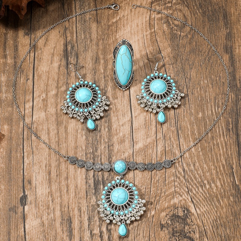 European and American cross-border retro ethnic turquoise bohemian earrings ring necklace suit female jewelry wholesale