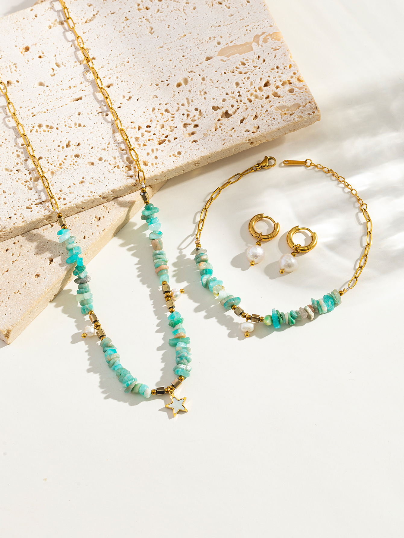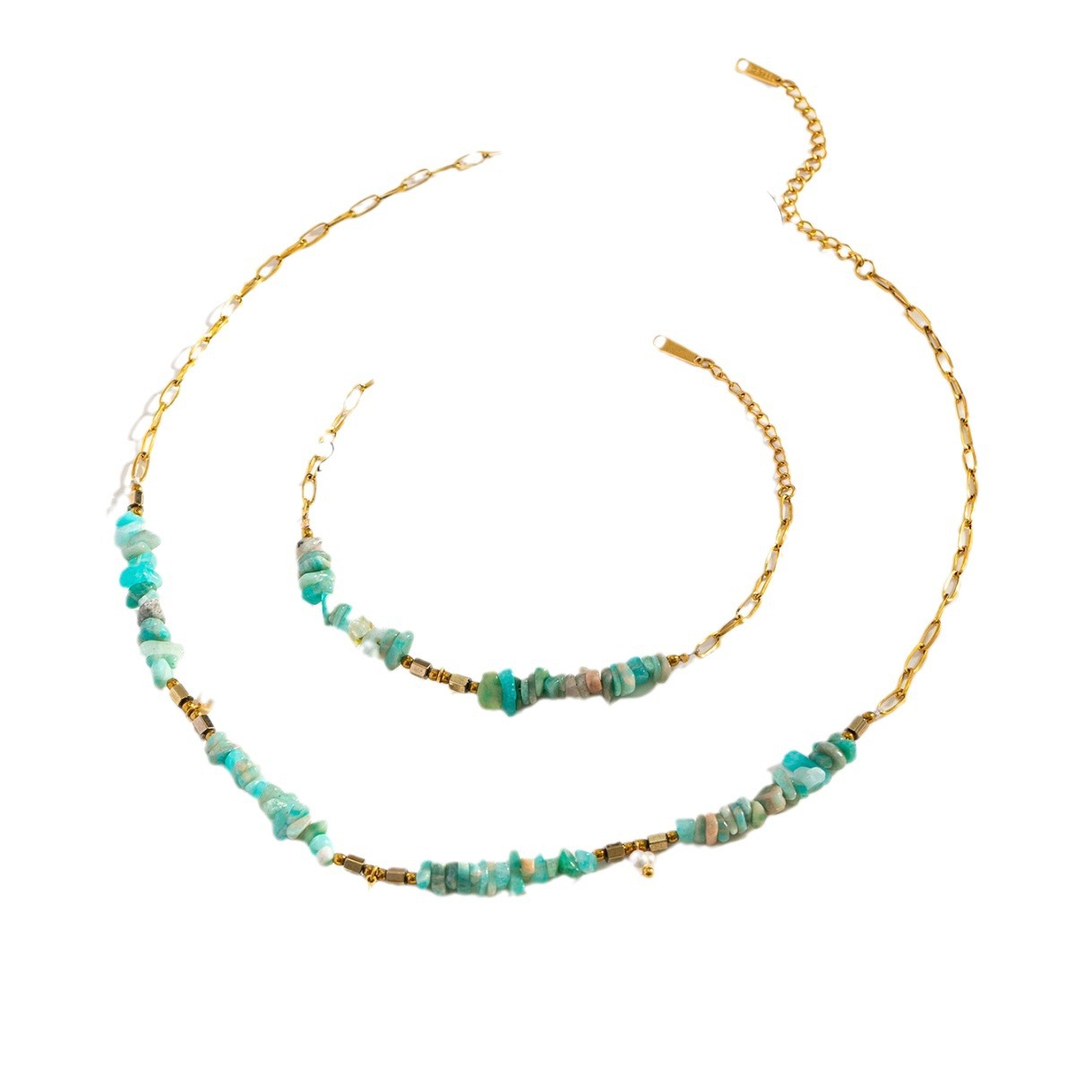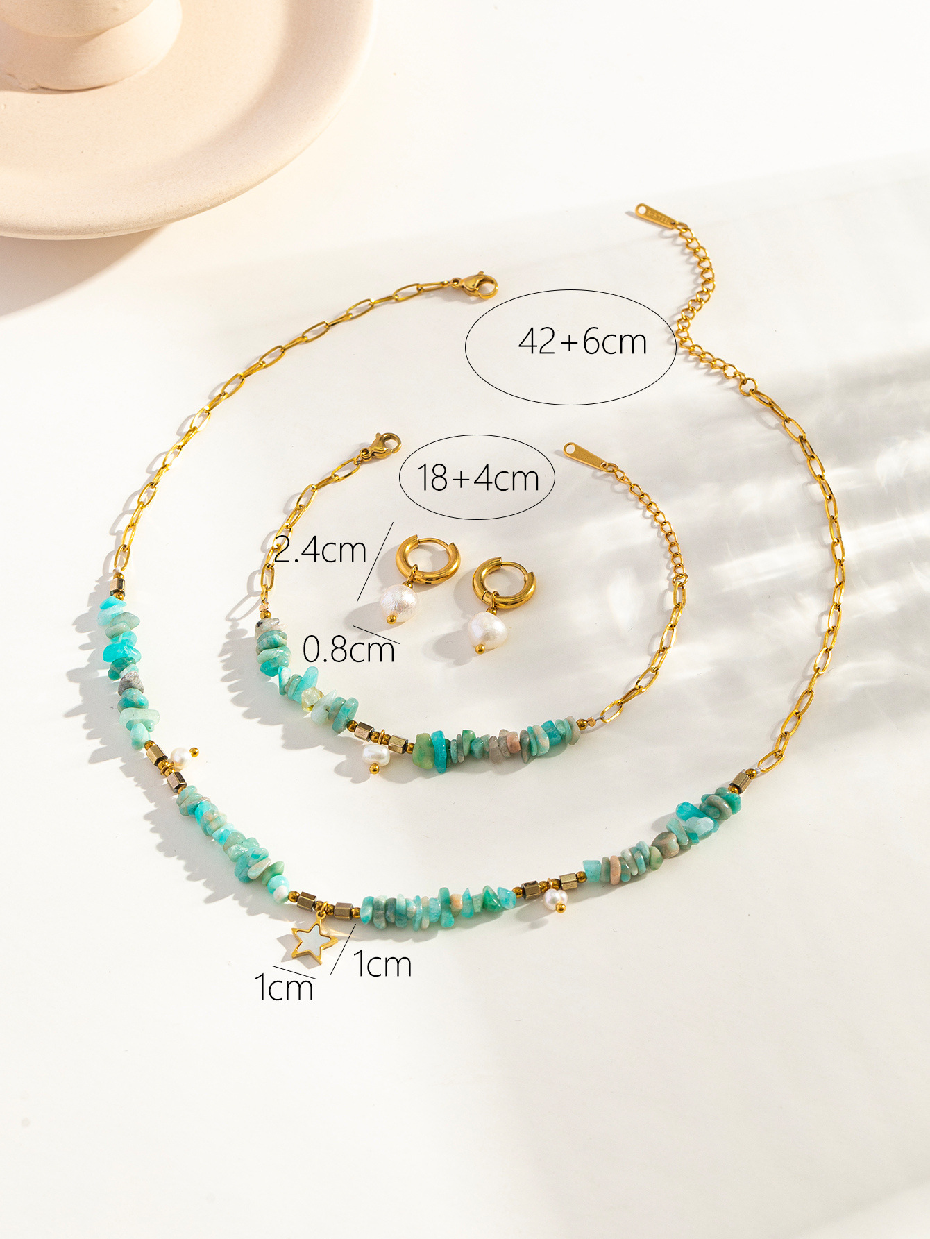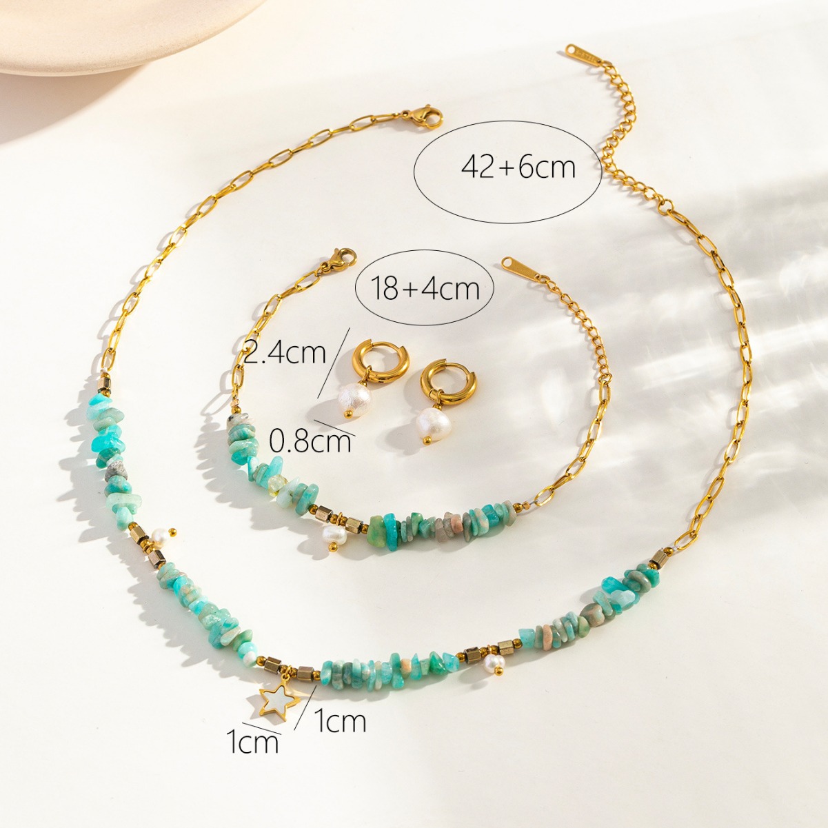Cross-border Europe and the United States INS wind female stainless steel jewelry suit green dongling natural gravel freshwater pearl pendant necklace