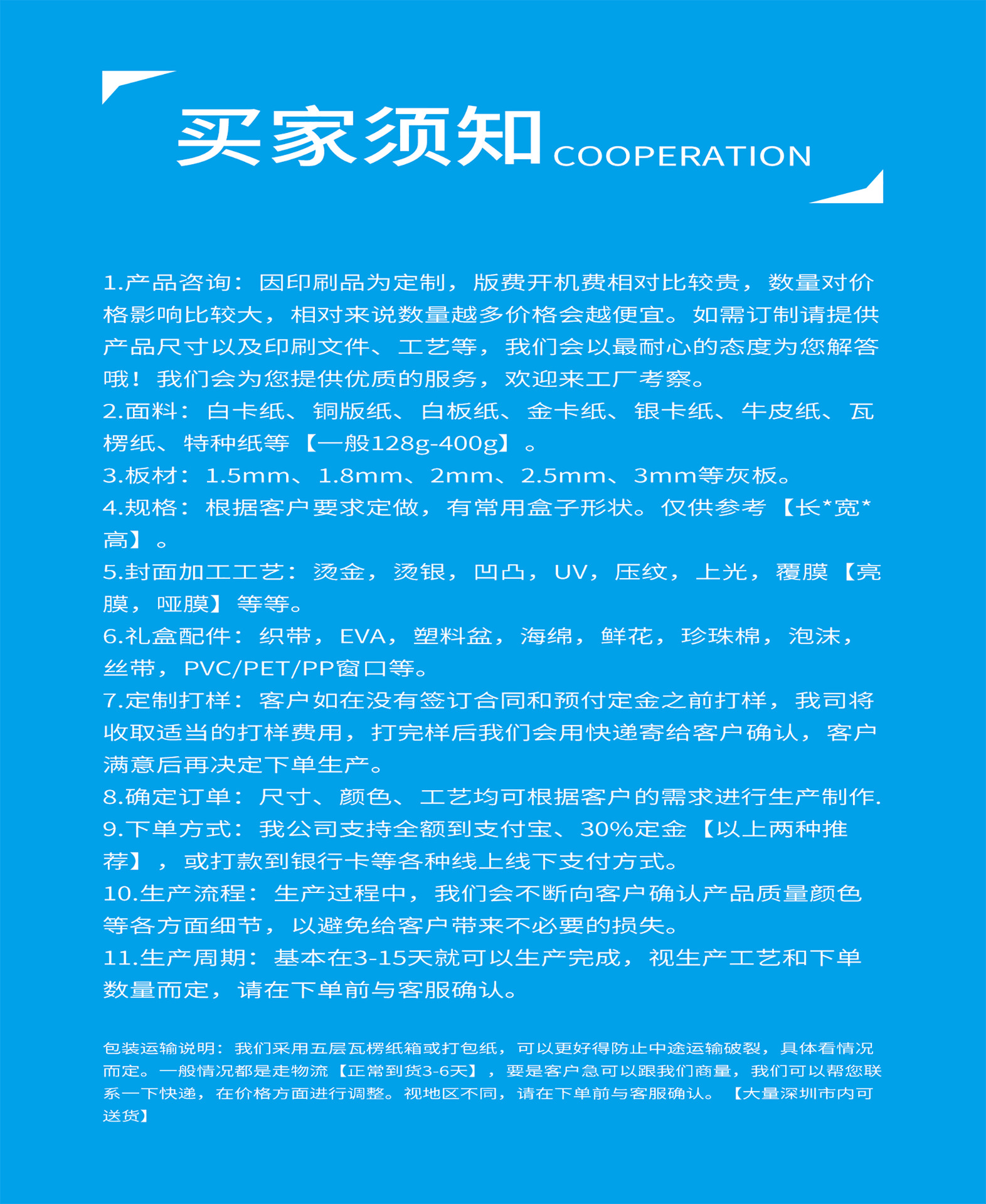 4、定做价格与市场上的通用盒子批发价有很大的不同,请不要以批发价衡量议价,谢谢合作!