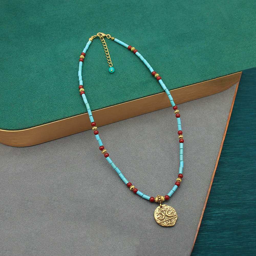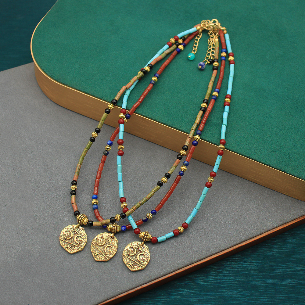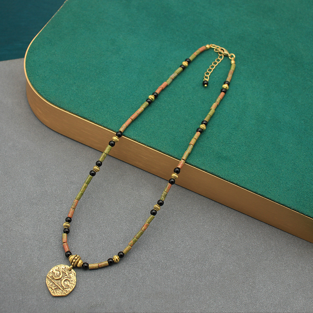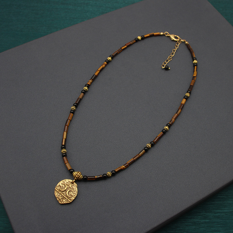 Natural Tiger Eye stone necklace vintage plated 24K old gold agate earrings necklace suit artistic retro handmade beaded