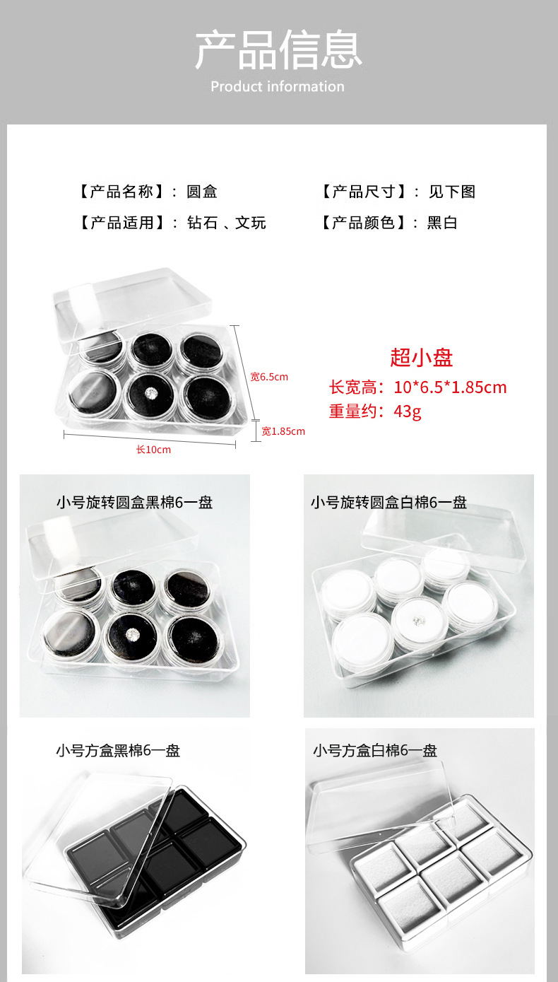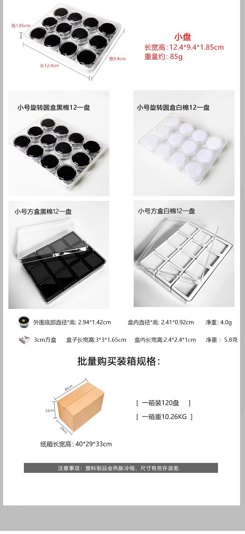 Specification model: Plastic plate with lid, 12 small rotating lid boxes, black cotton; tray with lid