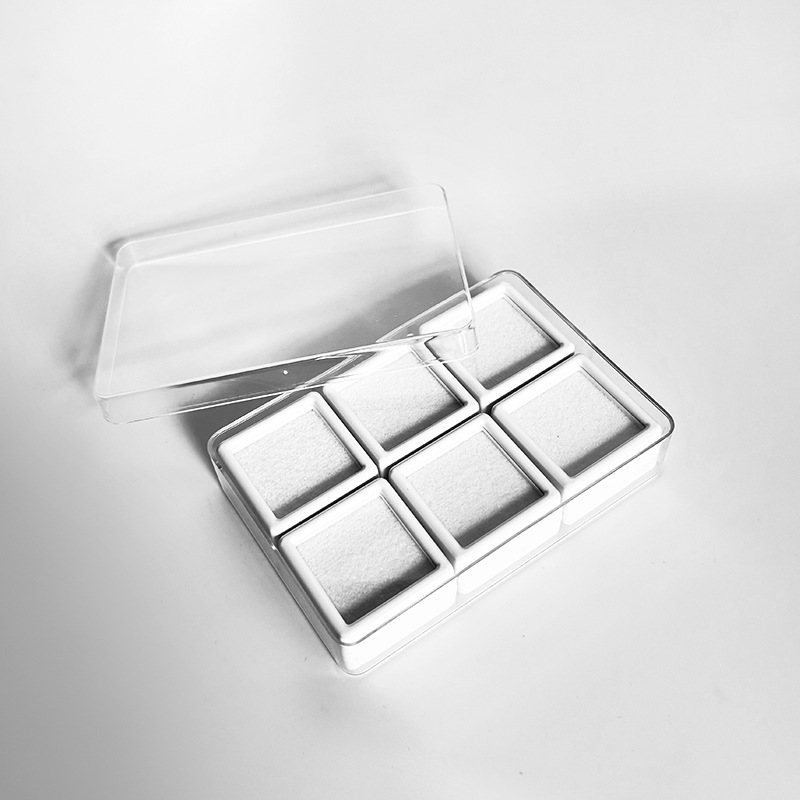 Specification model: Plastic plate with lid, 6 white square boxes and white cotton; tray with lid