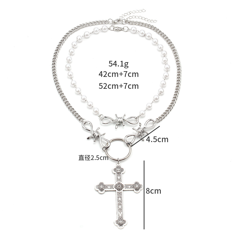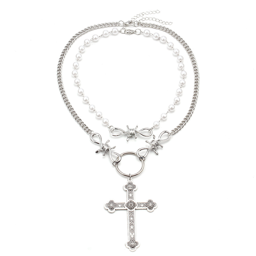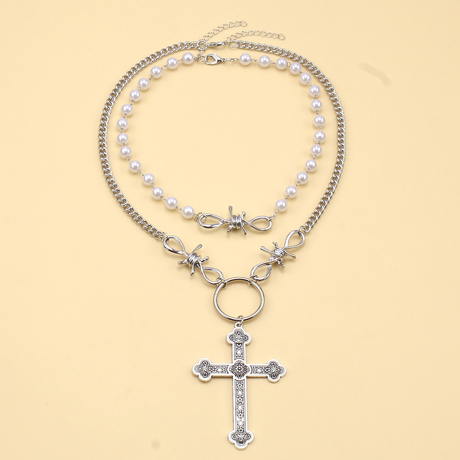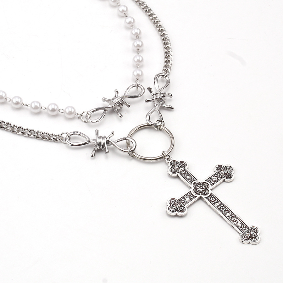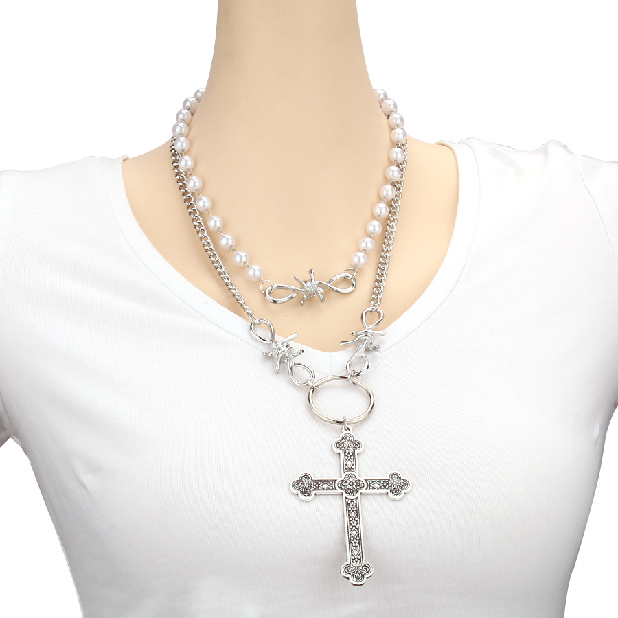 European and American Cross-Border Jewelry Personalized Pearl Cross Pendant Necklace Ins Hip-Hop Punk Double-Layer Sweet and Cool Necklace