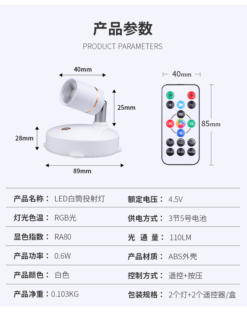 产品尺寸:灯头长40mm,灯杆高25mm 灯座直径80mm(底盖最宽处89mm),灯座高28mm,产品净重:110g
