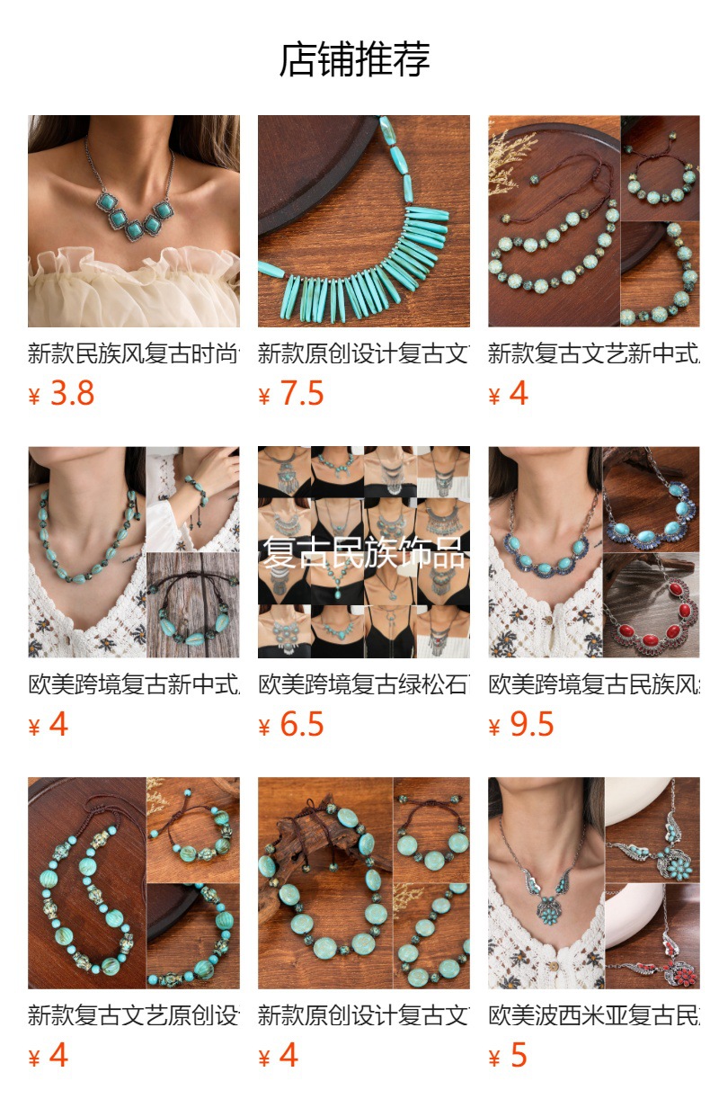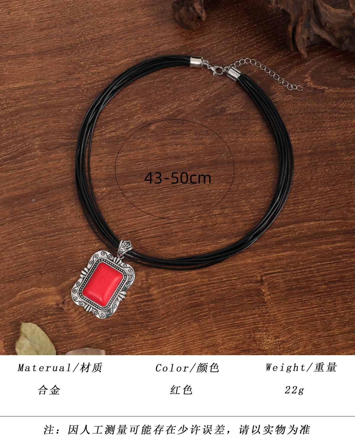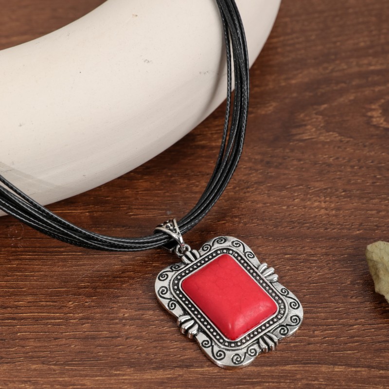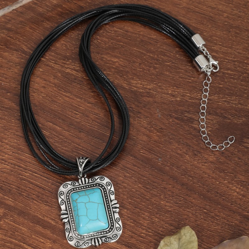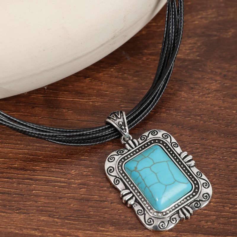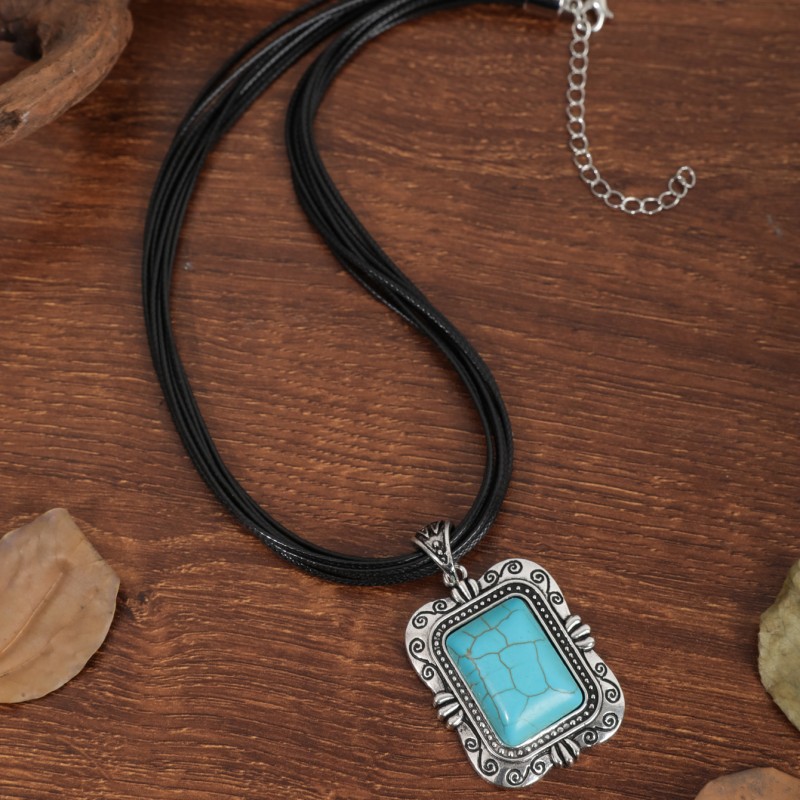 European and American cross-border bohemian Retro ethnic style turquoise necklace female personality square pendant clavicle chain wholesale