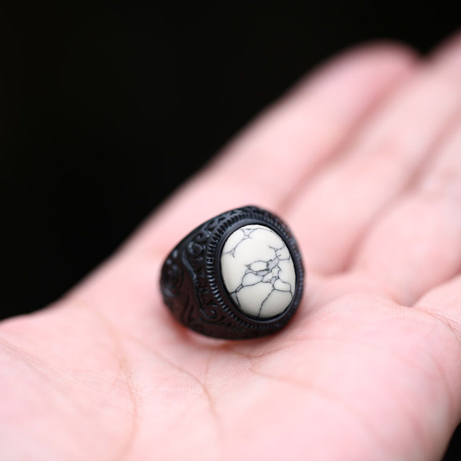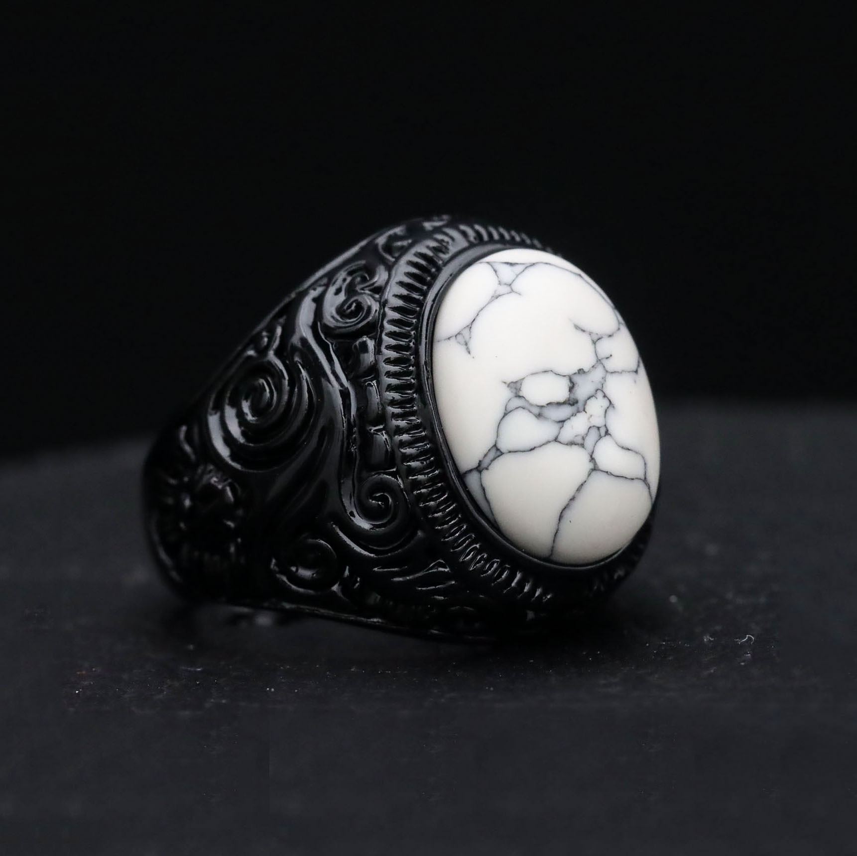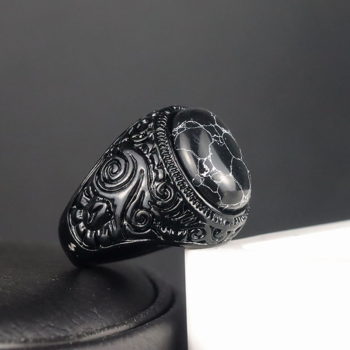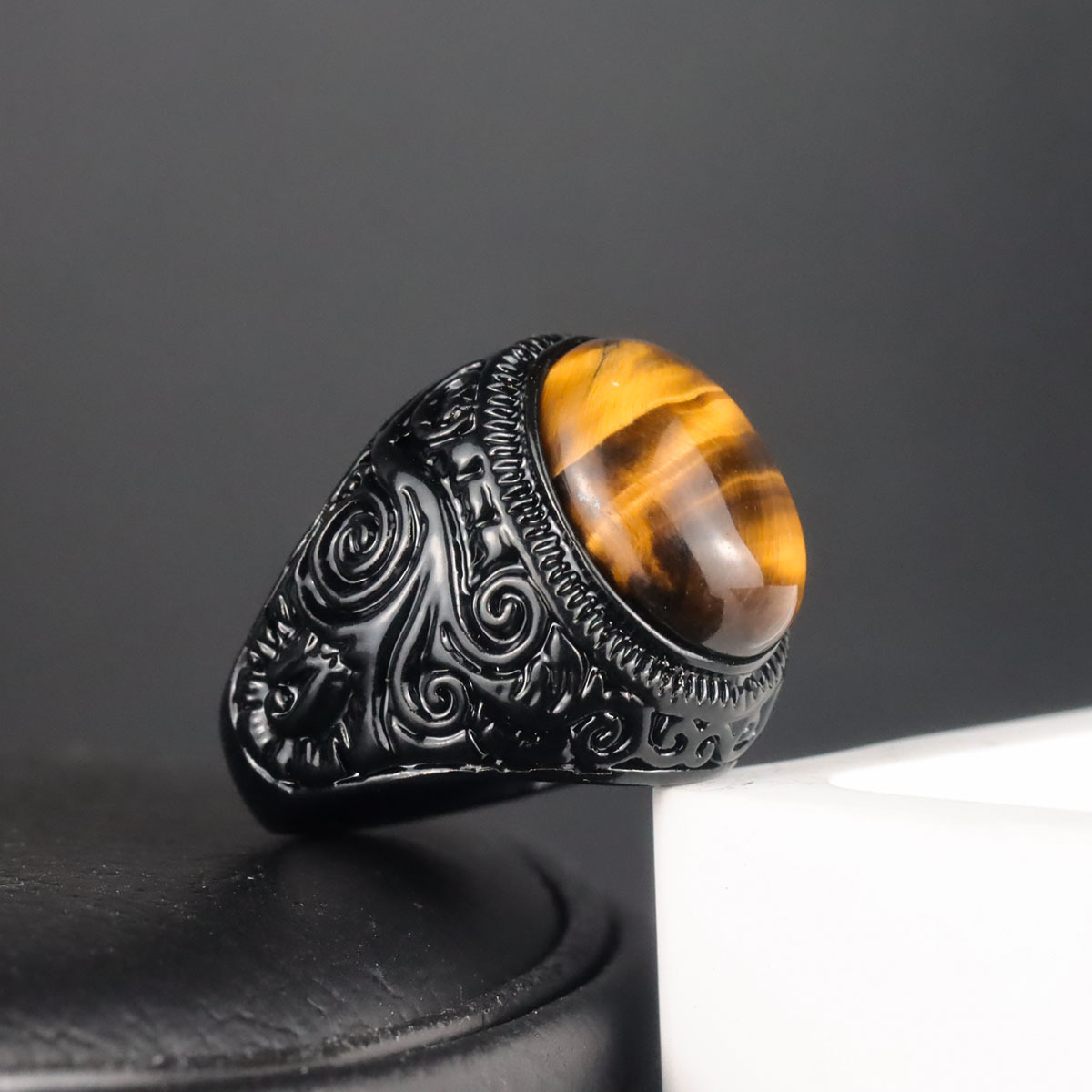 Qiyu European and American retro Tiger Eye turquoise black carved punk men's fashion bracelet ethnic style alloy ring ring