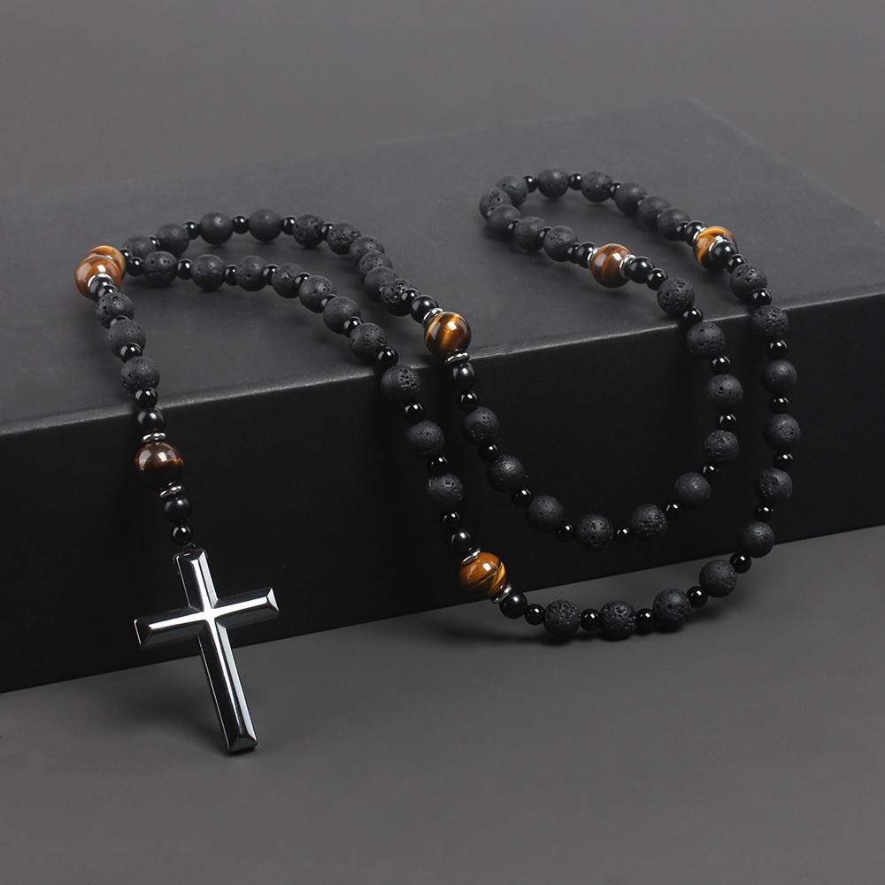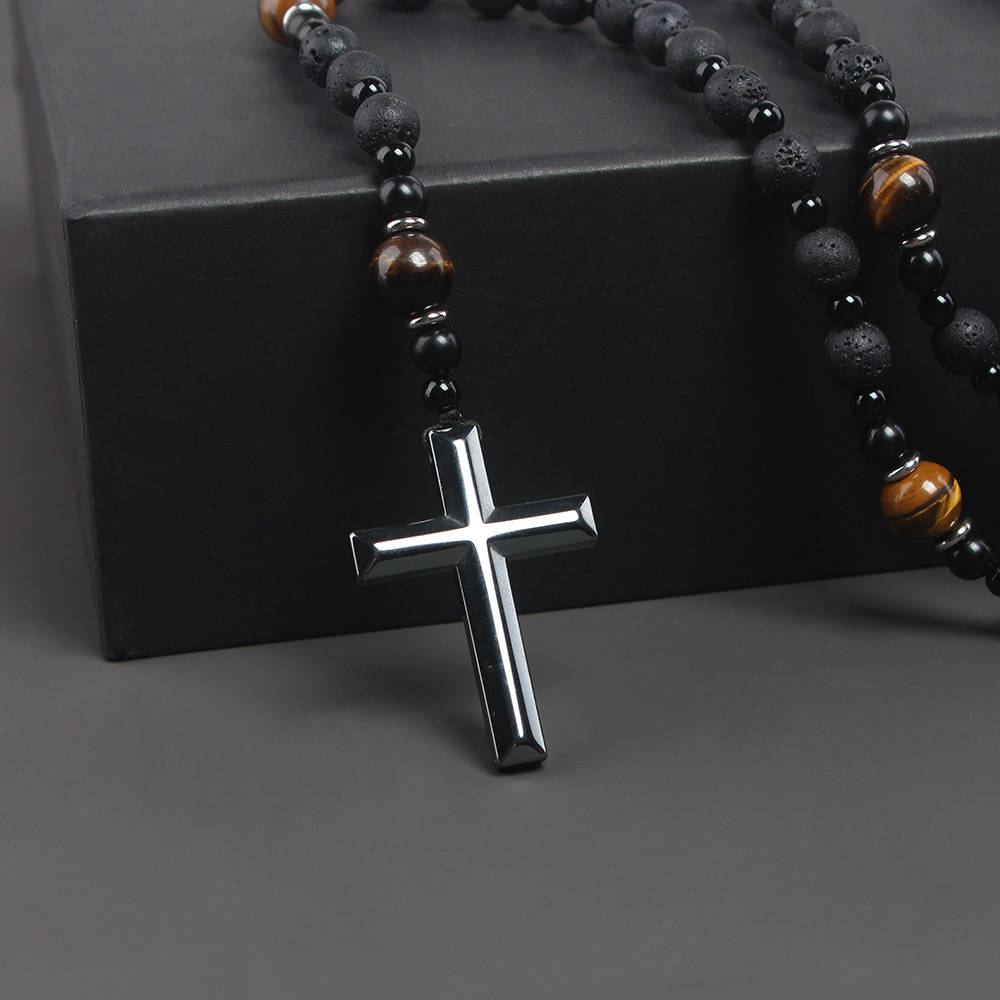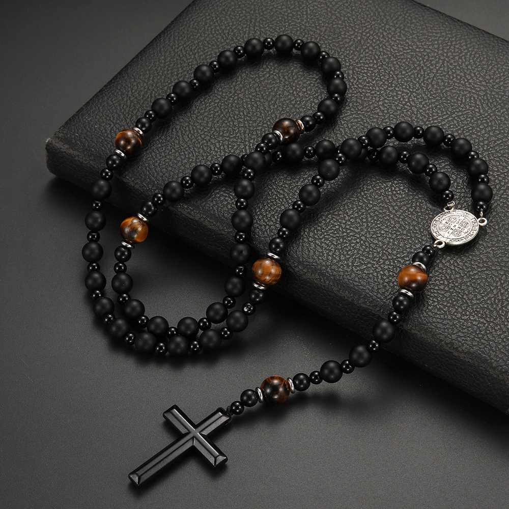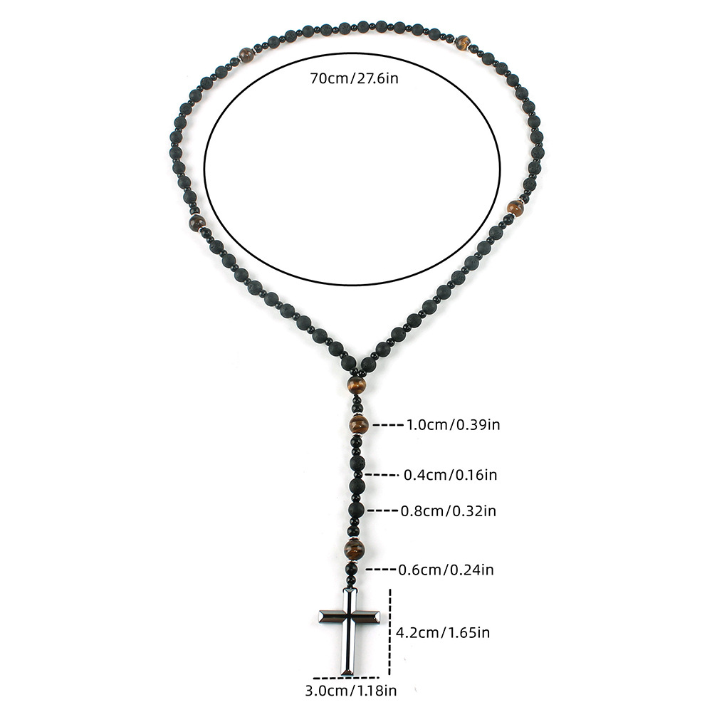 2022跨境新款ins风简约复古黑色玛瑙圆珠念珠十字架串珠项链现货批发