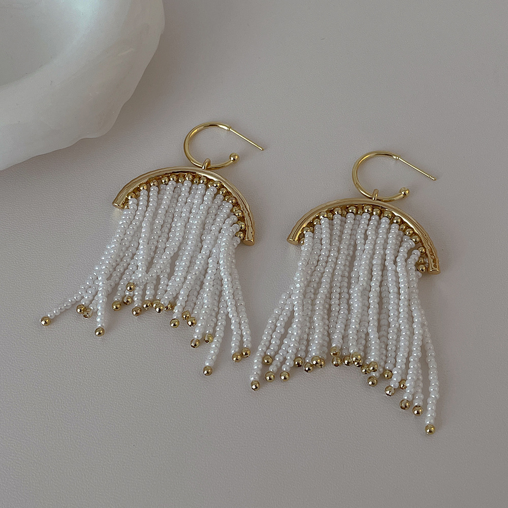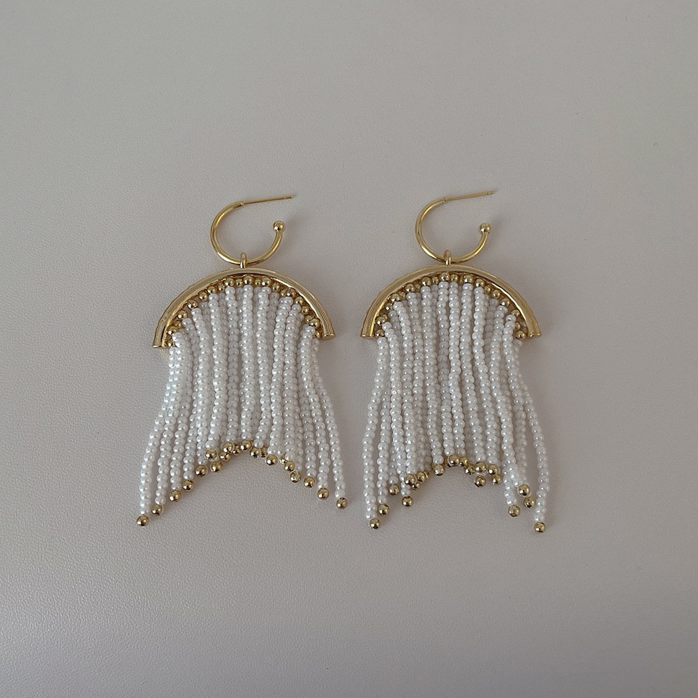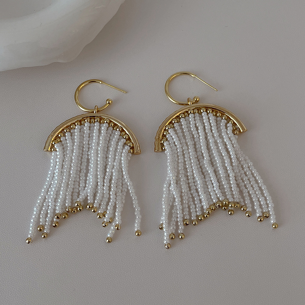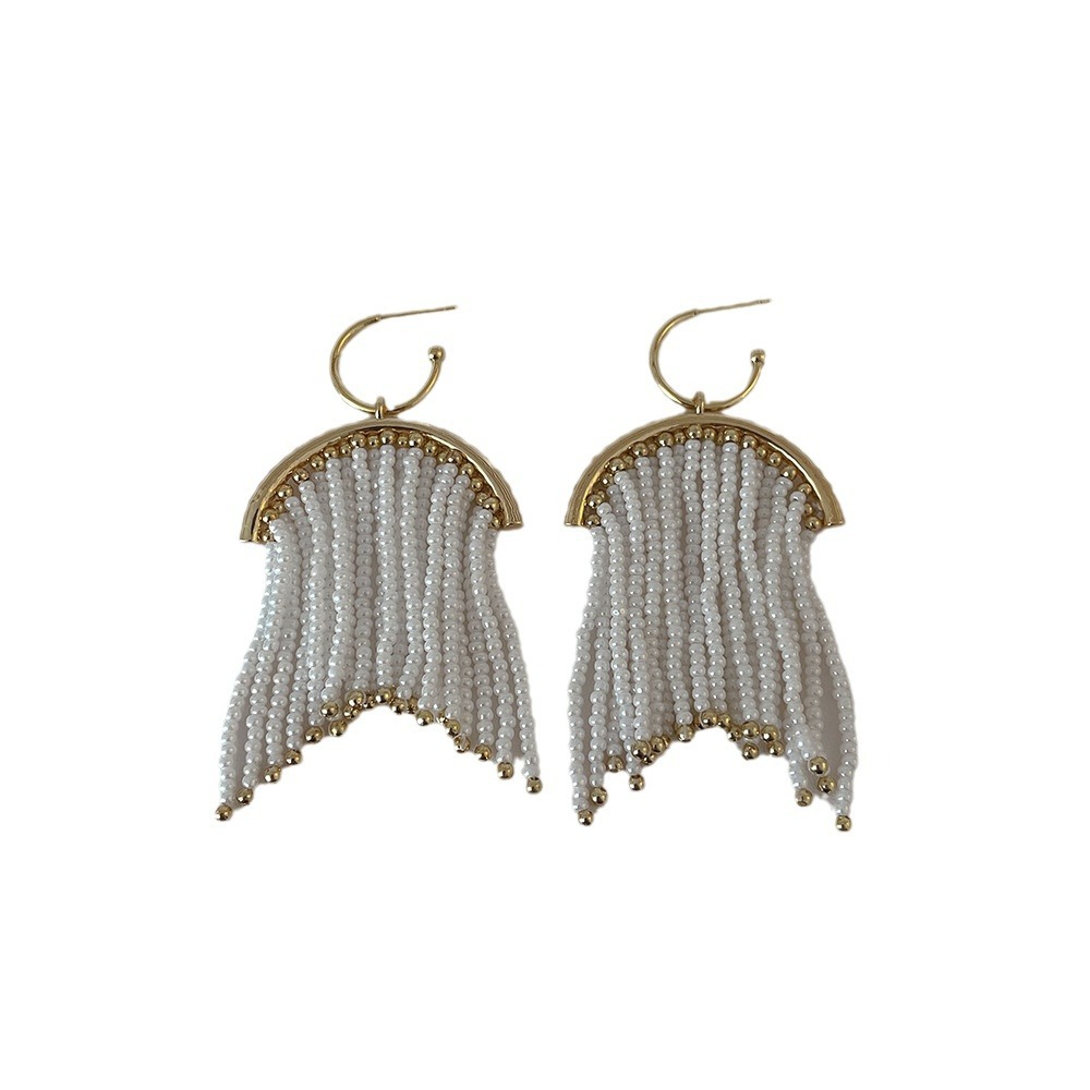 French retro design handmade white beaded tassel metal earrings female s925 silver needle European and American exaggerated earrings
